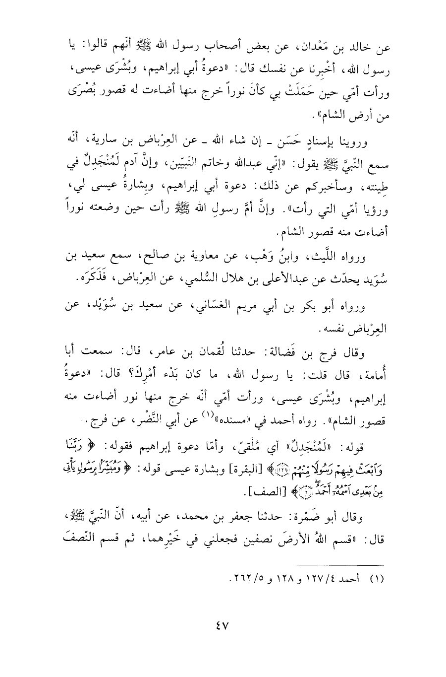 عن خالد بن معدان، عن بعض أصحاب رسول الله صلى الله عليه وسلم أنهم قالوا: يا رسول الله، أخبرنا عن نفسك قال: "دعوة أبي إبراهيم، وبشرى عيسى، ورأت أمي حين حملت بي كأن نورا خرج منها أضاءت له قصور بصرى من أرض الشام".