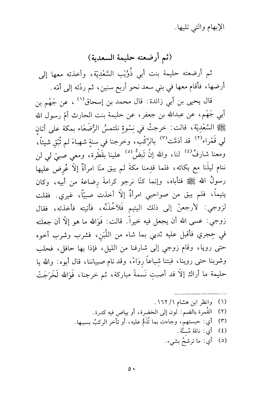 قال يحيى بن أبي زائدة: قال محمد بن إسحاق عن جهم بن أبي جهم، عن عبد الله جعفر، عن حليمة بنت الحارث أم رسول الله صلى الله عليه وسلم السعدية، قالت: خرجت في نسوة نلتمس الرضعاء بمكة على أتان لي قمراء قد أذمت بالركب، وخرجنا في سنة شهباء لم تبق شيئا، ومعنا شارف لنا، والله إن تبض علينا بقطرة، ومع صبي لي لن ننام ليلنا