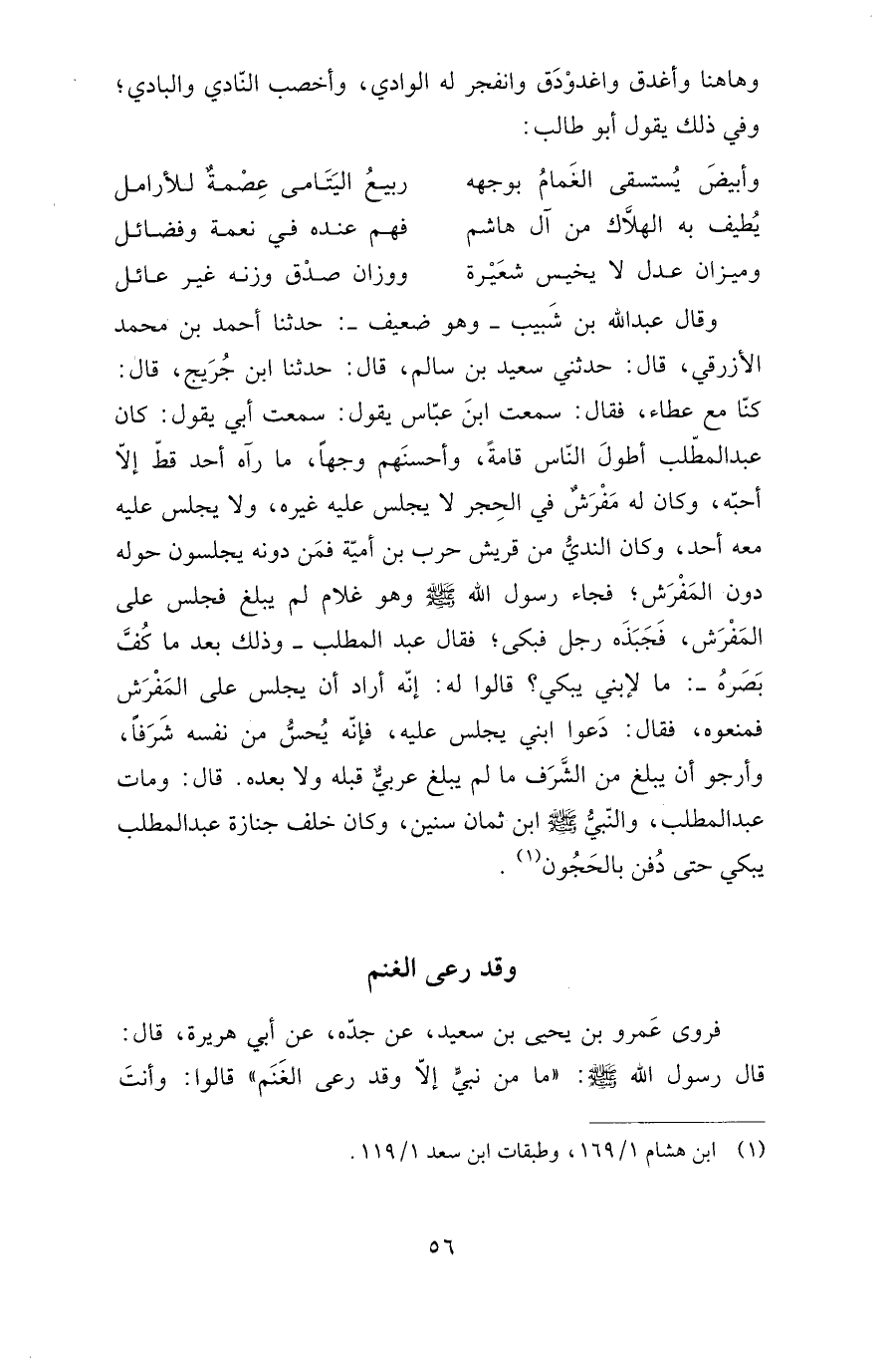 وقال عبد الله بن شبيب وهو ضعيف: حدثنا أحمد بن محمد الأزرقي، قال: حدثني سعيد بن سالم، قال: حدثنا ابن جريج، قال: كنا مع عطاء، فقال: سمعت ابن عباس يقول: سمعت أبي يقول: كان عبد المطلب أطول الناس قامة، وأحسنهم وجها، ما رآه أحد قط إلا أحبه، وكان له مفرش في الحجر لا يجلس عليه غيره، ولا يجلس عليه معه أحد، وكان الندي من قريش حرب بن أمية فمن دونه يجلسون حوله دون المفرش؛ فجاء رسول الله صلى الله عليه وسلم وهو غلام لم يبلغ فجلس على المفرش، فجبذه رجل فبكى؛ فقال عبد المطلب -وذلك بعدما كف بصره: ما لابني يبكي؟ قالوا له: إنه أراد أن يجلس على المفرش فمنعوه، فقال: دعوا ابني يجلس عليه، فإنه يحس من نفسه شرفا، وأرجو أن يبلغ من الشرف ما لم يبلغ عربي قبله ولا بعده. قال: ومات عبد المطلب، والنبي صلى الله عليه وسلم ابن ثمان سنين، وكان خلف جنازة عبد المطلب يبكي حتى دفن بالحجون.
