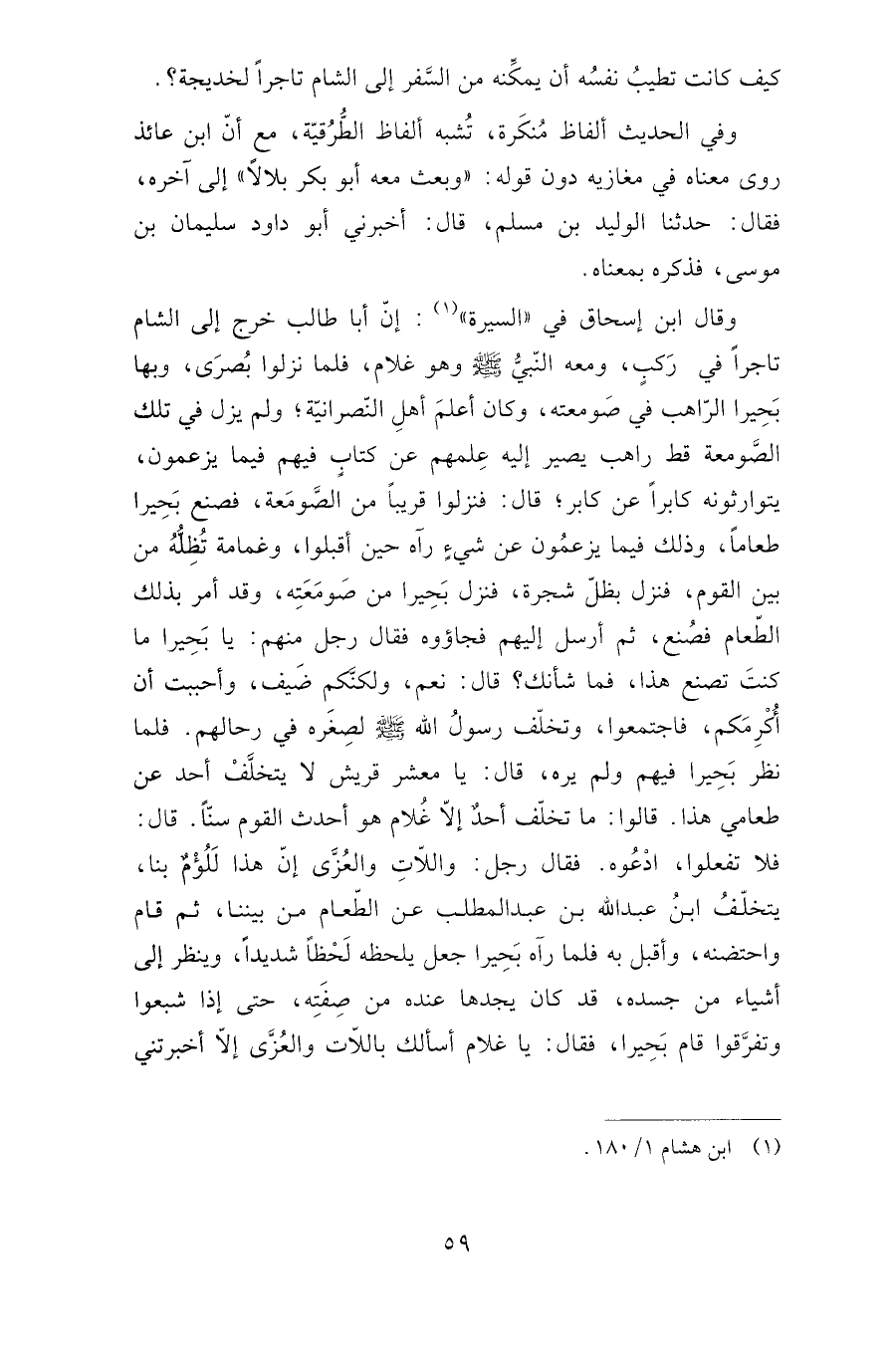 وقال ابن إسحاق في "السيرة": إن أبا طالب خرج إلى الشام تاجرا في ركب، ومعه النبي صلى الله عليه وسلم وهو غلام، فلما نزلوا بصرى، وبها بحيرا الراهب في صومعته، وكان أعلم أهل النصرانية؛ ولم يزل في تلك الصومعة قط راهب يصير إليه علمهم عن كتاب فيهم فيما يزعمون، يتوارثونه كابرا؛ عن كابر قال: فنزلوا قريبا من الصومعة، فصنع بحيرا طعاما، وذلك فيما يزعمون عن شيء رآه حين أقبلوا، وغمامة تظله من بين القوم، فنزل بظل شجرة، فنزل بحيرا من صومعته، وقد أمر بذلك الطعام فصنع، ثم أرسل إليهم فجاءوه فقال رجل منهم: يا بحيرا ما كنت تصنع هذا، فما شأنك؟ قال: نعم، ولكنكم ضيف، وأحببت أن أكرمكم، فاجتمعوا، وتخلف رسول الله صلى الله عليه وسلم لصغره في رحالهم. فلما نظر بحيرا فيهم ولم يره، قال: يا معشر قريش لا يتخلف أحد عن طعامي هذا. قالوا: ما تخلف أحد إلا غلام هو أحدث القوم سنا. قال: فلا تفعلوا، ادعوه. فقال رجل: واللات والعزى إن هذا للؤم بنا، يتخلف ابن عبد الله بن عبد المطلب عن الطعام من بيننا، ثم قام واحتضنه، وأقبل به فلما رآه بحيرا جعل يلحظه شديدا، وينظر إلى أشياء من جسده، قد كان يجدها عنده من صفته، حتى إذا شبعوا وتفرقوا قام بحيرا، فقال: يا غلام أسألك باللات والعزى إلا أخبرتني