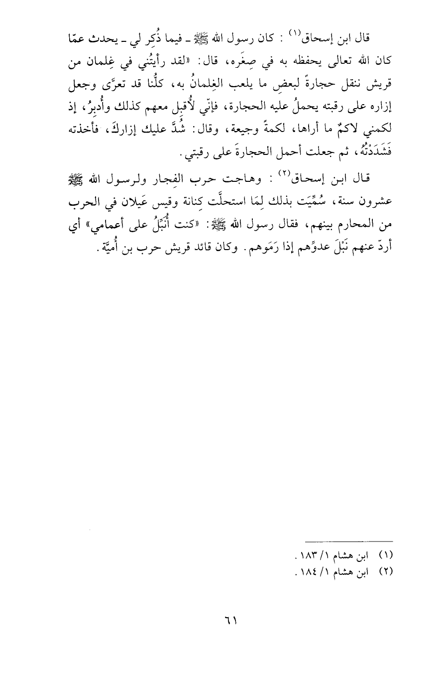 قال ابن إسحاق: كان رسول الله صلى الله عليه وسلم -فيما ذكر لي- يحدث عما كان الله تعالى يحفظه به في صغره، قال: "لقد رأيتني في غلمان من قريش ننقل حجارة لبعض ما يلعب الغلمان به، كلنا قد تعرى وجعل إزاره على رقبته يحمل عليه الحجارة، فإني لأقبل معهم كذلك وأدبر، إذ لكمني لاكم ما أراها، لكمة وجيعة، وقال: شد عليك إزارك، فأخذته فشددته، ثم جعلت أحمل الحجارة على رقبتي".