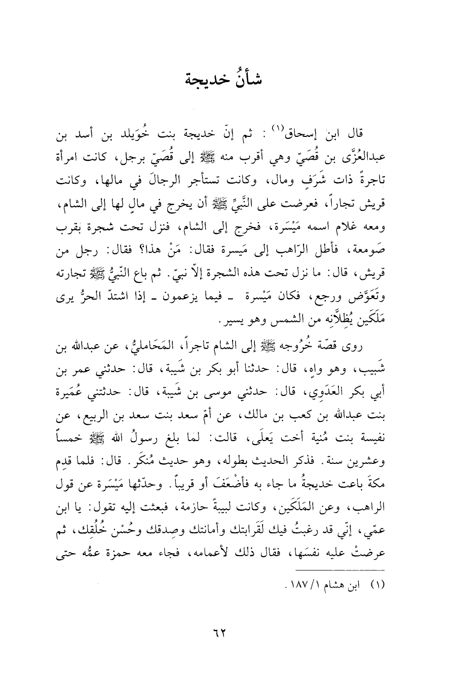 روى قصة خروجه صلى الله عليه وسلم إلى الشام تاجرا، المحاملي، عن عبد الله بن شبيب وهو واه، قال: حدثنا أبو بكر بن شيبة، قال: حدثني عمر بن أبي بكر العدوي، قال: حدثني بن شيبة، قال: حدثتني عميرة بنت عبد الله بن كعب بن مالك، عن أم سعد بنت سعد بن الربيع، عن نفيسة بنت منية أخت يعلى، قالت: لما بلغ رسول الله صلى الله عليه وسلم خمسا وعشرين سنة. فذكر الحديث بطوله، وهو حديث منكر. قال: فلما قدم مكة باعت خديجة ما جاء به فأضعف أو قريبا. وحدثها ميسرة عن قول الراهب، وعن الملكين، وكانت لبيبة حازمة، فبعثت إليه تقول: يابن عمي، إني قد رغبت فيك لقرابتك وأمانتك وصدق وحسن خلقك، ثم عرضت عليه نفسها، فقال ذلك لأعمامه، فجاء معه حمزة عمه حتى