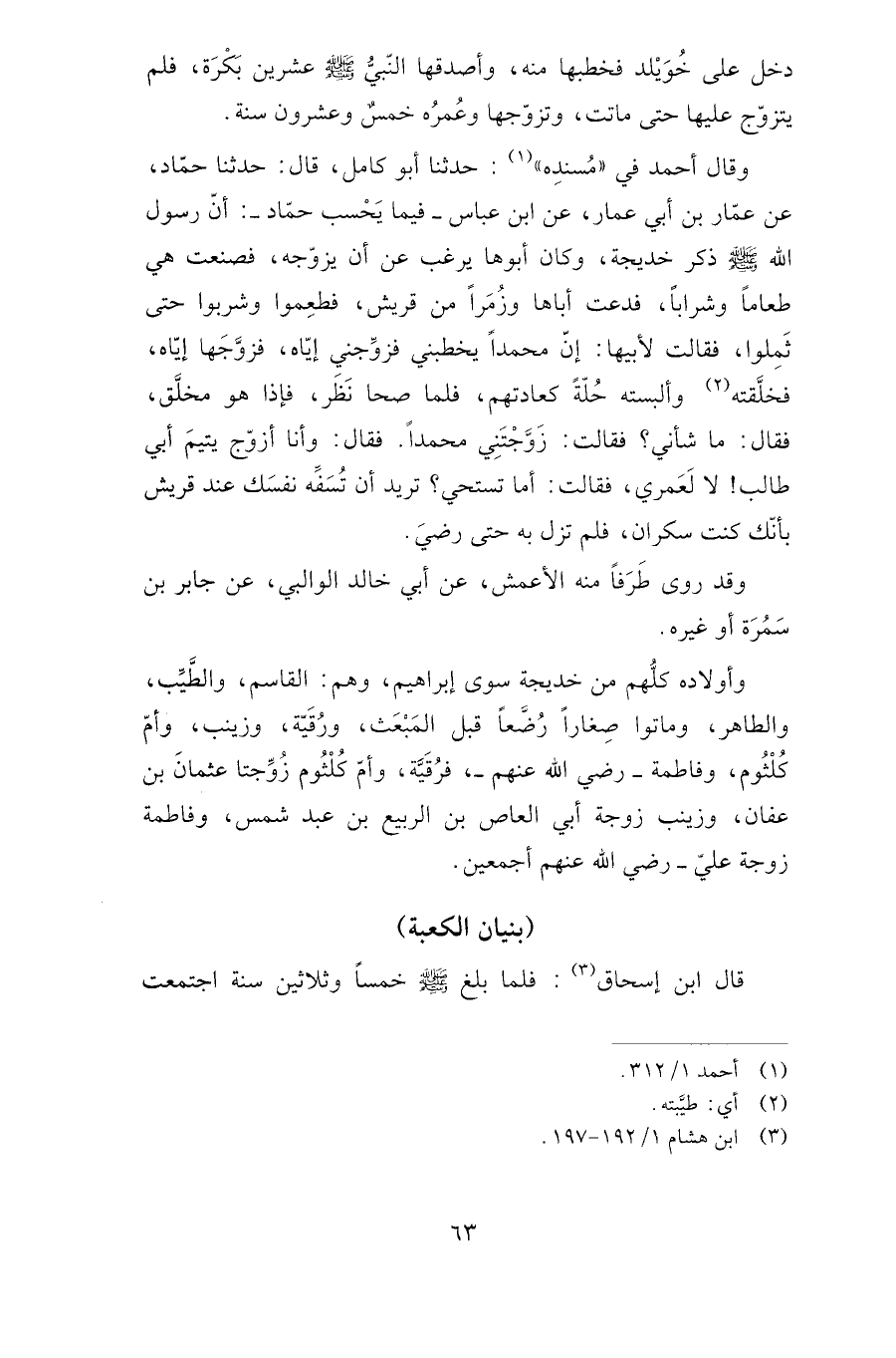 وقال أحمد في "مسنده": حدثنا أبو كامل، قال: حدثنا حماد، عن عمار بن أبي عمار، عن ابن عباس -فيما يحسب حماد: أن رسول الله صلى الله عليه وسلم ذكر خديجة، وكان أبوها يرغب عن أن يزوجه، فصنعت هي طعاما وشرابا، فدعت أبها وزمرا من قريش، فطعموا وشربوا حتى ثملوا، فقالت لأبيها: إن محمدا يخطبني فزوجني إياه، فزوجها إياه، فخلقته وألبسته حلة كعادتهم، فلما صحا نظر، فإذا هو مخلق، فقال: ما شأني؟ فقالت: زوجتني محمدا. فقال: وأنا أزوج يتيم أبي طالب! لا لعمري، فقالت: أما تستحيي؟ تريد أن تسفه نفسك عند قريش بأنك كنت سكران، فلم تزل به حتى رضي.