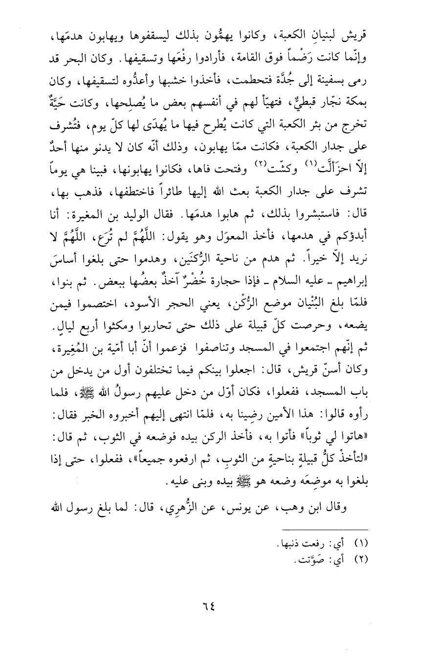 قال: فاستبشروا بذلك، ثم هابوا هدمها. فقال الوليد بن المغيرة: أنا أبدؤكم في هدمها، فأخذ المعول وهو يقول: اللهم لم ترع، اللهم لا نريد إلا خيرا. ثم هدم من ناحية الركنين، وهدموا حتى بلغوا أساس إبراهيم -عليه السلام- فإذا حجارة خضر آخذ بعضها ببعض. ثم بنوا، فلما بلغ البنيان موضع الركن، يعني الحجر الأسود، اختصموا فيمن يضعه، وحرصت كل قبيلة على ذلك حتى تحاربوا ومكثوا أربع ليال. ثم إنهم اجتمعوا في المسجد وتناصفوا فزعموا أن أبا أمية بن المغيرة, وكان أسن قريش، قال: اجعلوا بينكم فيما تختلفون أول من يدخل من باب المسجد، ففعلوا، فكان أول من دخل عليهم رسول الله صلى الله عليه وسلم، فلما رأوه قالوا: هذا الأمين رضينا به، فلما انتهى إليهم أخبروه الخبر فقال: "هاتوا لي ثوبا". فأتوا به، فأخذ الركن بيده فوضعه في الثوب، ثم قال: "لتأخذ كل قبيلة بناحية من الثوب، ثم ارفعوه جميعا". ففعلوا، حتى إذا بلغوا به موضعه وضعه هو صلى الله عليه وسلم بيده وبنى عليه.
