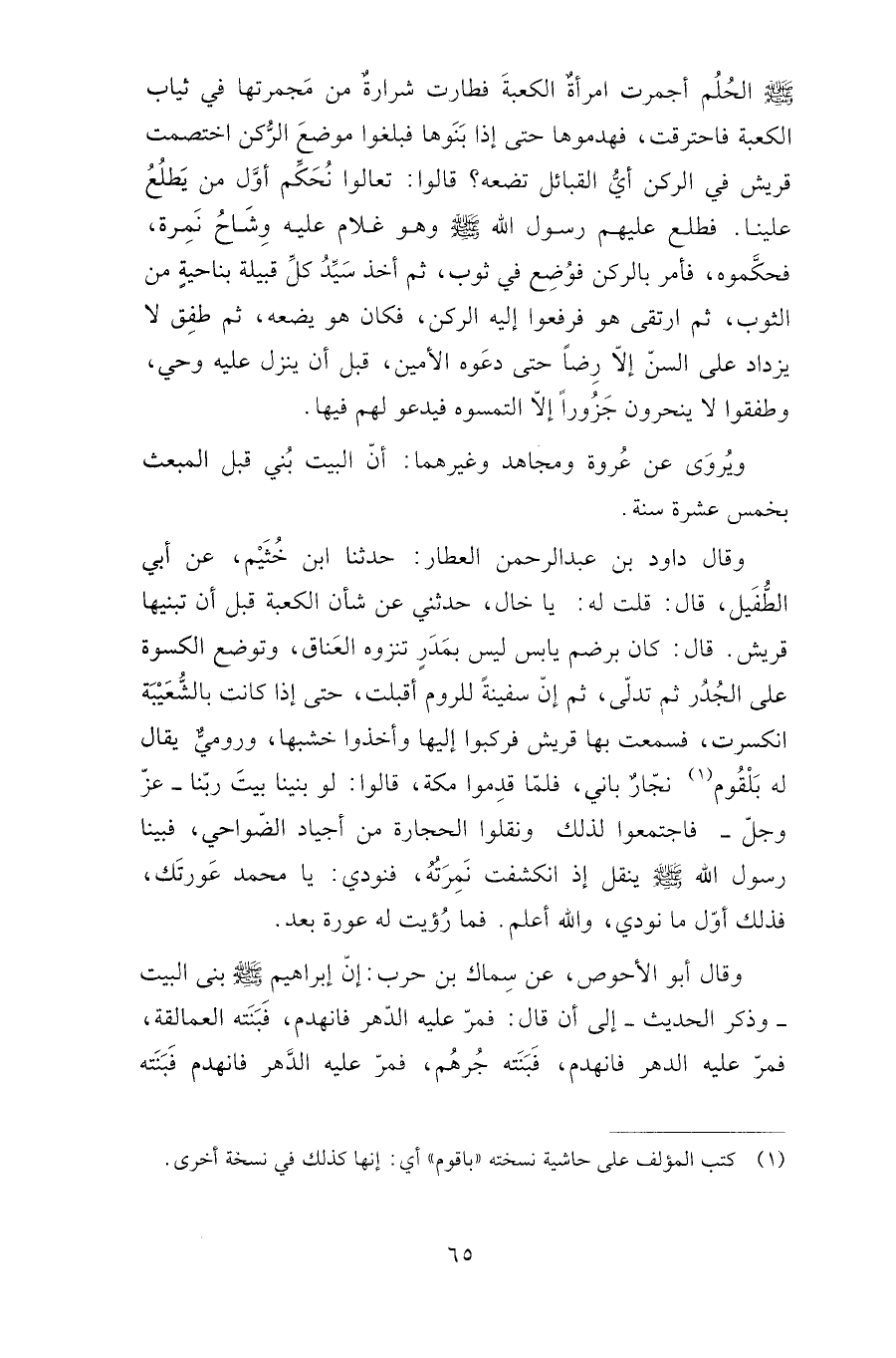 وقال داود بن عبد الرحمن العطار: حدثنا ابن خثيم، عن أبي الطفيل، قال: قلت له: يا خال، حدثني عن شأن الكعبة قبل أن تبنيها قريش. قال: كان برضم يابس ليس بمدر تنزوه العناق، وتوضع الكسوة على الجدر ثم تدلى، ثم إن سفينة للروم أقبلت، حتى إذا كانت بالشعيبة انكسرت، فسمعت بها قريش فركبوا إليها وأخذوا خشبها، ورومي يقال له: بلقوم نجار بان، فلما قدموا مكة، قالوا: لو بنينا بيت ربنا -عز وجل- فاجتمعوا لذلك ونقلوا الحجارة من أجياد الضواحي، فبينا رسول الله صلى الله عليه وسلم ينقل إذ انكشفت نمرته فنودي: يا محمد عورتك، فذلك أول ما نودي، والله أعلم. فما رؤيت له عورة بعد.