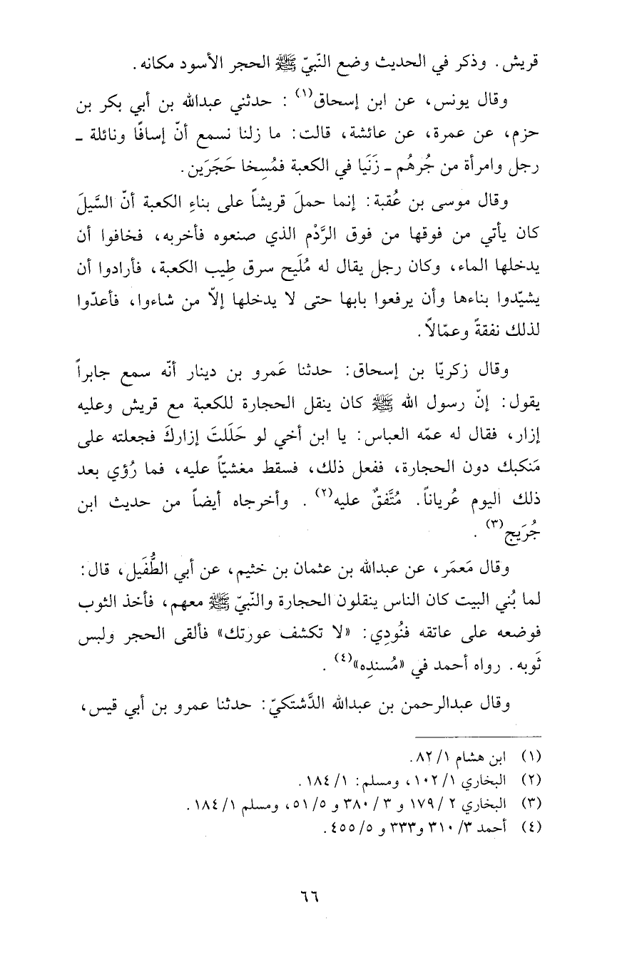 وقال زكريا بن إسحاق: حدثنا عمرو بن دينار أنه سمع جابرا يقول: إن رسول الله صلى الله عليه وسلم كان ينقل الحجارة للكعبة مع قريش وعليه إزار، فقال له عمه العباس: يابن أخي لو حللت إزارك فجعلته على منكب دون الحجارة، ففعل ذلك، فسقط مغشيا عليه، فما رؤي بعد ذلك اليوم عريانا. متفق عليه. وأخرجاه أيضا من حديث ابن جريج.
