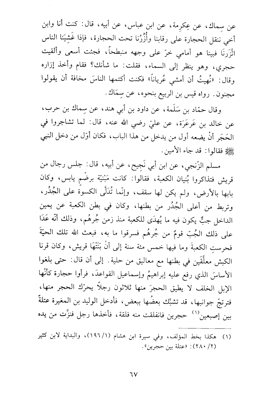 عن سماك، عن عكرمة، عن ابن عباس، عن أبيه، قال: كنت أنا وابن أخي ننقل الحجارة على رقابنا وأزرنا تحت الحجارة، فإذا غشينا الناس اتزرنا فبينا هو أمامي خر على وجهه منبطحا، فجئت أسعى وألقيت حجري، وهو ينظر إلى السماء، فقلت: ما شأنك؟ فقام وأخذ إزاره وقال: "نهيت أن أمشي عريانا". فكنت أكتمها الناس مخافة أن يقولوا مجنون. رواه قيس بن الربيع بنحوه، عن سماك.