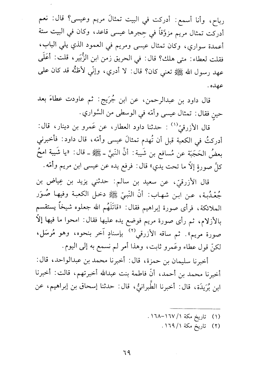 قال داود بن عبد الرحمن، عن ابن جريج: ثم عاودت عطاء بعد حين فقال: تمثال عيسى وأمه في الوسطى من السواري.