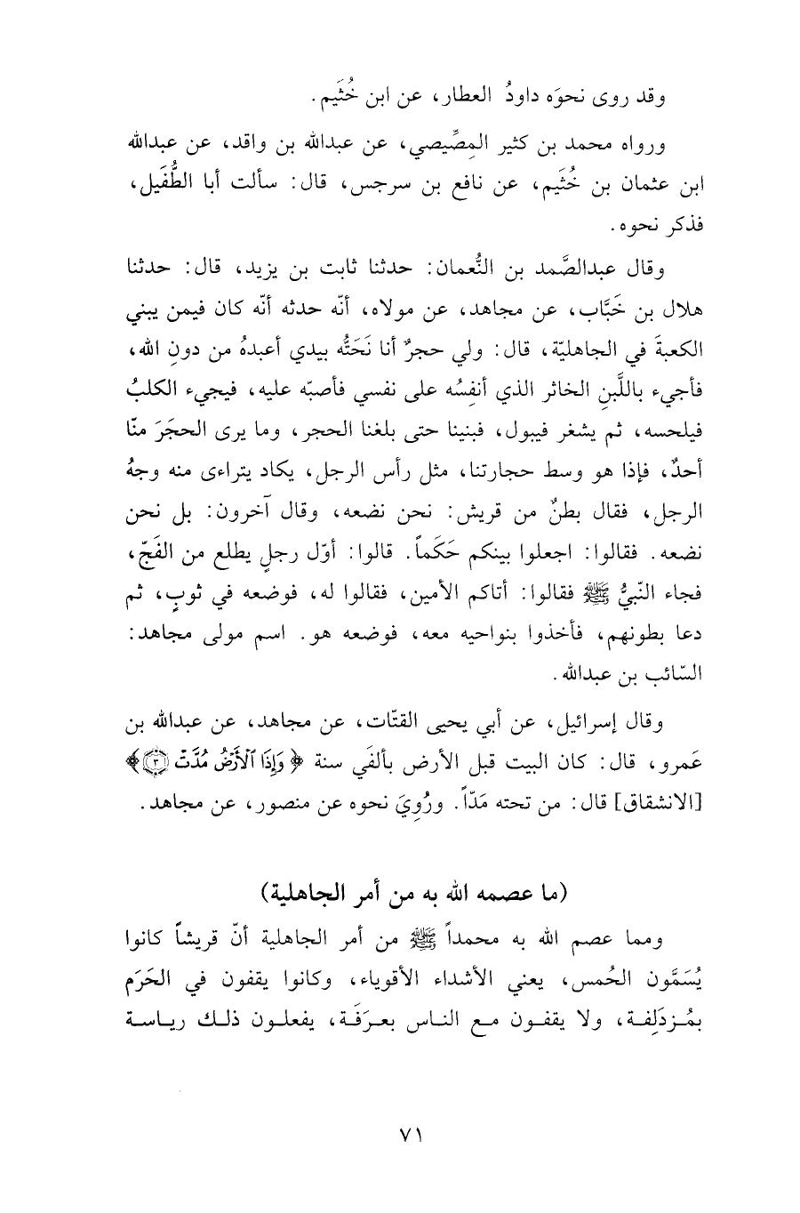 وقال عبد الصمد بن النعمان: حدثنا ثابت بن يزيد، قال: حدثنا هلال بن خباب، عن مجاهد، عن مولاه، أنه حدثه أنه كان فيمن يبني الكعبة في الجاهلية، قال: ولى حجر أنا نحته بيدي أعبده من دون الله، فأجيء باللبن الخاثر الذي أنفسه على نفسي فأصبه عليه، فيجيء الكلب فيلحسه، ثم يشغر فيبول، فبنينا حتى بلغنا الحجر، وما يرى الحجر منا أحد، فإذا هو وسط حجارتنا، مثل رأس الرجل، يكاد يتراءى منه وجه الرجل، فقال بطن من قريش: نحن نضعه، وقال آخرون: بل نحن نضعه. فقالوا: اجعلوا بينكم حكما. قالوا: أول رجل يطلع من الفج، فجاء النبي صلى الله عليه وسلم فقالوا: أتاكم الأمين، فقالوا له، فوضعه في ثوب، ثم دعا بطونهم، فأخذوا بنواحيه معه، فوضعه هو. اسم مولى مجاهد: السائب بن عبد الله.