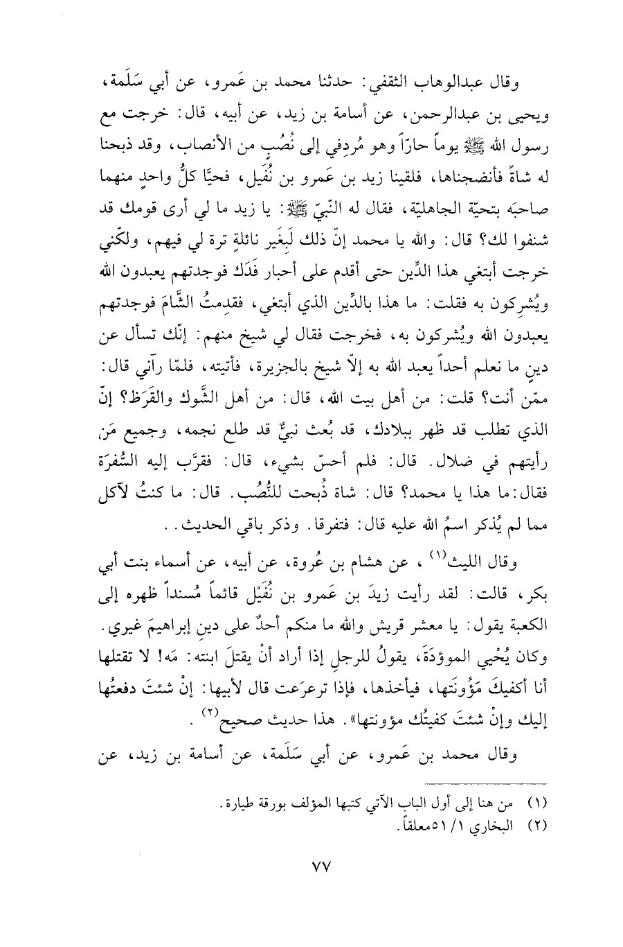 وقال عبد الوهاب الثقفي: حدثنا محمد بن عمرو، عن أبي سلمة، ويحيى بن عبد الرحمن، عن أسامة بن زيد، عن أبيه، قال: خرجت مع رسول الله صلى الله عليه وسلم يوما حارا وهو مردفي إلى نصب من الأنصاب، وقد ذبحنا له شاة فأنضجناها، فلقينا زيد بن عمرو بن نفيل، فحيا كل واحد منهما صاحبه بتحية الجاهلية، فقال له النبي صلى الله عليه وسلم: يا زيد ما لي أرى قومك قد شنفوا لك؟ قال: والله يا محمد إن ذلك لبغير نائلة ترة لي فيهم, ولكني خرجت أبتغي هذا الدين حتى أقدم على أحبار فدك فوجدتهم يعبدون الله ويشركون به فقلت: ما هذا بالدين الذي أبتغي، فقدمت الشام فوجدتهم يعبدون الله ويشركون به، فخرجت فقال لي شيخ منهم: إنك تسأل عن دين ما نعلم أحدا يعبد الله به إلا شيخ بالجزيرة، فأتيته، فلما رآني قال: ممن أنت؟ قلت: من أهل بيت الله، قال: من أهل الشوك والقرظ؟ إن الذي تطلب قد ظهر ببلادك، قد بعث نبي قد طلع نجمه، وجميع من رأيتهم في ضلال. قال: فلم أحس بشيء، قال: فقرب إليه السفرة فقال: ما هذا يا محمد؟ قال: شاة ذبحت للنصب قال: ما كنت لآكل مما لم يذكر اسم الله عليه قال: فتفرقا. وذكر باقي الحديث.