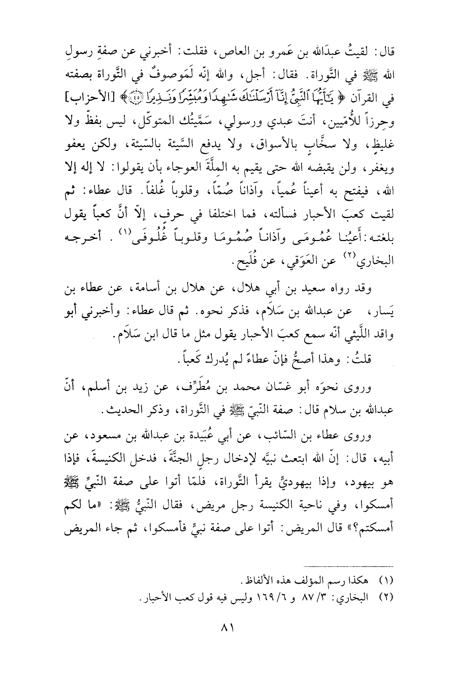 قال: لقيت عبد الله بن عمرو بن العاص, فقلت: أخبرني عن صفة رسول الله صلى الله عليه وسلم في التوراة فقال: أجل، والله إنه لموصوف في التوراة بصفته في القرآن {يَا أَيُّهَا النَّبِيُّ إِنَّا أَرْسَلْنَاكَ شَاهِدًا وَمُبَشِّرًا وَنَذِيرًا} [الأحزاب: 45] ، وحرزا للأميين، أنت عبدي ورسولي، سميتك المتوكل، ليس بفظ ولا غليظ، ولا سخاب بالأسواق، ولا يدفع السيئة بالسيئة، ولكن يعفو ويغفر، ولن يقبضه الله حتى يقيم به الملة العوجاء بأن يقولوا: لا إله إلا الله، فيفتح به أعينا عميا، وآذانا صما، وقلوبا غلفا. قال عطاء: ثم لقيت كعب الأحبار فسألته، فما اختلفا في حرف، إلا أن كعبا يقول بلغته: أعينا عمومى وآذانا صمومى وقلوبا غلوفى. أخرجه البخاري عن العوقي، عن فليح.