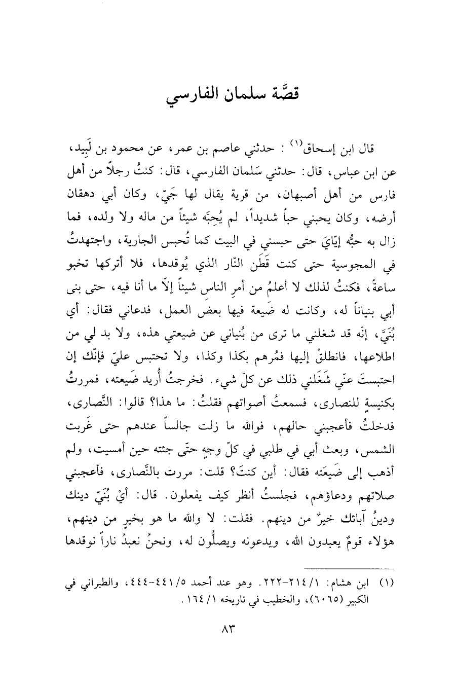 قال ابن إسحاق: حدثني عاصم بن عمر، عن محمود بن لبيد, عن ابن عباس، قال: حدثني سلمان الفارسي، قال: كنت رجلا من أهل فارس من أهل أصبهان، من قرية يقال لها: جي، وكان أبي دهقان أرضه, وكان يحبني حبا شديدا، لم يحبه شيئا من ماله ولا ولده، فما زال به حبه إياي حتى حبسني في البيت كما تحبس الجارية، واجتهدت في المجوسية حتى كنت قطن النار الذي يوقدها، فلا أتركها تخبو ساعة، فكنت لذلك لا أعلم من أمر الناس شيئا إلا ما أنا فيه، حتى بنى أبي بنيانا له، وكانت له ضيعة فيها بعض العمل، فدعاني فقال: أي بني، إنه قد شغلني ما ترى من بنياني عن ضيعتي هذه، ولا بد لي من اطلاعها، فانطلق إليها فمرهم بكذا وكذا، ولا تحتبس علي فإنك إن احتبست عني شغلني ذلك عن كل شيء. فخرجت أريد ضيعته، فمررت بكنيسة للنصارى، فسمعت أصواتهم فقلت: ما هذا؟ قالوا: النصارى، فدخلت فأعجبني حالهم، فوالله ما زلت جالسا عندهم حتى غربت الشمس، وبعث أبي في طلبي في كل وجه حتى جئته حين أمسيت، ولم أذهب إلى ضعيفته فقال: أين كنت؟ قلت: مررت بالنصارى، فأعجبني صلاتهم ودعاؤهم، فجلست أنظر كيف يفعلون. قال: أي بني دينك ودين آبائك خير من دينهم. فقلت: لا والله ما هو بخير من دينهم، هؤلاء قوم يعبدون الله، ويدعونه ويصلون له، ونحن نعبد نارا نوقدها