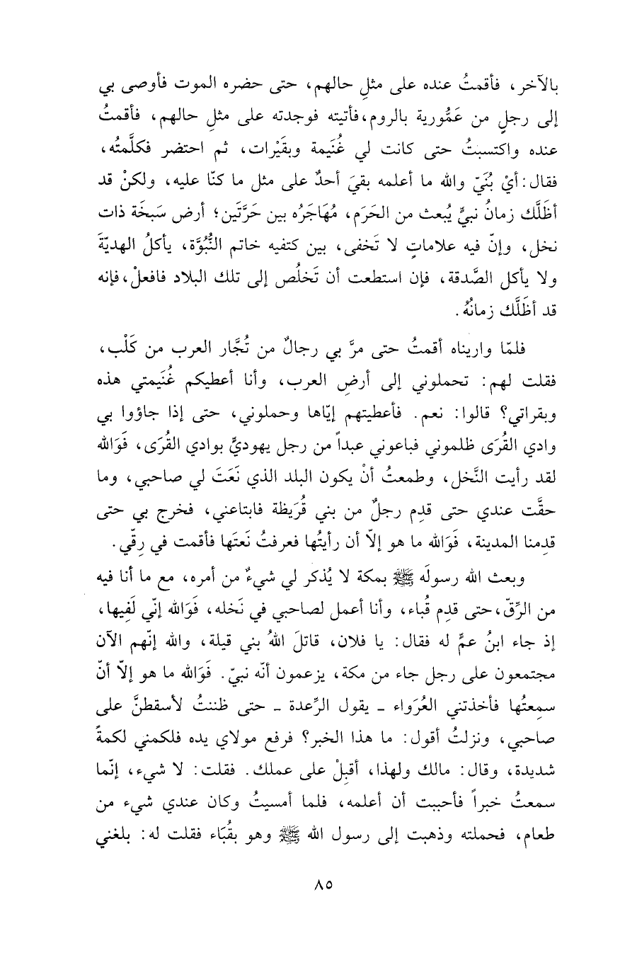 بالآخر، فأقمت عنده على مثل حالهم، حتى حضره الموت فأوصى بي إلى رجل من عمورية بالروم، فأتيته فوجدته على مثل حالهم، فأقمت عنده واكتسبت حتى كانت لي غنيمة وبقيرات، ثم احتضر فكلمته، فقال: أي بني والله ما أعلمه بقي أحد على مثل ما كنا عليه، ولكن قد أظلك زمان نبي يبعث من الحرم، مهاجره بين حرتين؛ أرض سبخة ذات نخل، وإن فيه علامات لا تخفى، بين كتفيه خاتم النبوة، يأكل الهدية ولا يأكل الصدقة، فإن استطعت أن تخلص إلى تلك البلاد فافعل، فإنه قد أظلك زمانه.