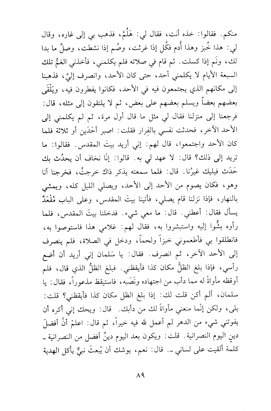 خبز وهذا أدم فكل إذا غرثت، وصم إذا نشطت، وصل ما بدا لك، ونم إذا كسلت. ثم قام في صلاته فلم يكلمني، فأخذني الغم تلك السبعة الأيام لا يكلمني أحد، حتى كان الأحد، وانصرف إلي، فذهبنا إلى مكانهم الذي يجتمعون فيه في الأحد، فكانوا يفطرون فيه، ويلقى بعضهم بعضا ويسلم بعضهم على بعض، ثم لا يلتقون إلى مثله، قال: فرجعنا إلى منزلنا فقال لي مثل ما قال أول مرة، ثم لم يكلمني إلى الأحد الآخر، فحدثت نفسي بالفرار فقلت: اصبر أحدين أو ثلاثة فلما كان الأحد واجتمعوا، قال لهم: إني أريد بيت المقدس. فقالوا: ما تريد إلى ذلك؟ قال: لا عهد لي به. قالوا: إنا نخاف أن يحدث بك حدث فيليك غيرنا. قال: فلما سمعته يذكر ذاك خرجت، فخرجنا أنا وهو، فكان يصوم من الأحد إلى الأحد، ويصلي الليل كله، ويمشي بالنهار، فإذا نزلنا قام يصلي، فأتينا بيت المقدس، وعلى الباب مقعد يسأل فقال: أعطني. قال: ما معي شيء. فدخلنا بيت المقدس، فلما رأوه بشوا إليه واستبشروا به، فقال لهم: غلامي هذا فاستوصوا به، فانطلقوا بي فأطعموني خبزا ولحما، ودخل في الصلاة، فلم ينصرف إلى الأحد الآخر، ثم انصرف. فقال: يا سلمان إني أريد أن أضع رأسي، فإذا بلغ الظل مكان كذا فأيقظني. فبلغ الظل الذي قال، فلم أوقظه مأواة له مما دأب من اجتهاده ونصبه، فاستيقظ مذعورا، فقال: يا سلمان، ألم أكن قلت لك: إذا بلغ الظل مكان كذا فأيقظني؟ قلت: بلى، ولكن إنما منعني مأواة لك من دأبك. قال: ويحك إني أكره أن يفوتني شيء من الدهر لم أعمل لله فيه خيرا، ثم قال: اعلم أن أفضل دين اليوم النصرانية قلت: ويكون بعد اليوم دين أفضل من النصرانية -كلمة ألقيت على لساني- قال: نعم، يوشك أن يبعث نبي يأكل الهدية