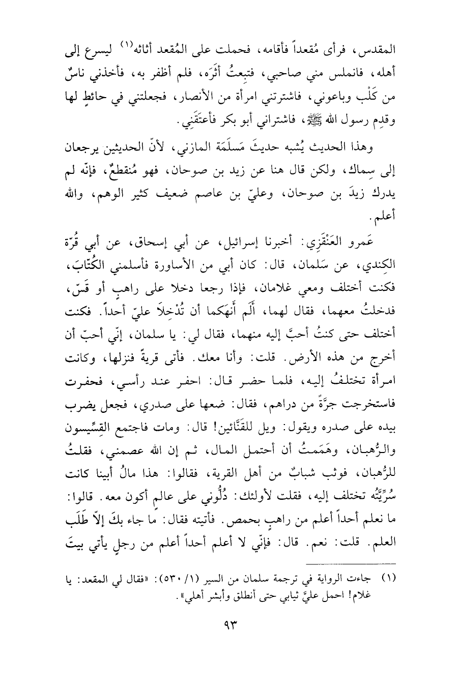 عمرو العنقزي: أخبرنا إسرائيل، عن أبي إسحاق، عن أبي قرة الكندي، عن سلمان، قال: كان أبي من الأساورة فأسلمني الكتاب، فكنت أختلف ومعي غلامان، فإذا رجعا دخلا على راهب أو قس، فدخلت معهما، فقال لهما، ألم أنهكما أن تدخلا علي أحدا. فكنت أختلف حتى كنت أحب إليه منهما، فقال لي: يا سلمان، إني أحب أن أخرج من هذه الأرض. قلت: وأنا معك فأتى قرية فنزلها, وكانت امرأة تختلف إليه، فلما حضر قال: احفر عند رأسي، فحفرت فاستخرجت جرة من دراهم، فقال: ضعها على صدري، فجعل يضرب بيده على صدره ويقول: ويل للقنائين! قال: ومات فاجتمع القسيسون والرهبان، وهممت أن أحتمل المال، ثم إن الله عصمني، فقلت للرهبان، فوثب شباب من أهل القرية، فقالوا: هذا مال أبينا كانت سريته تختلف إليه، فقلت لأولئك: دلوني على عالم أكون معه.