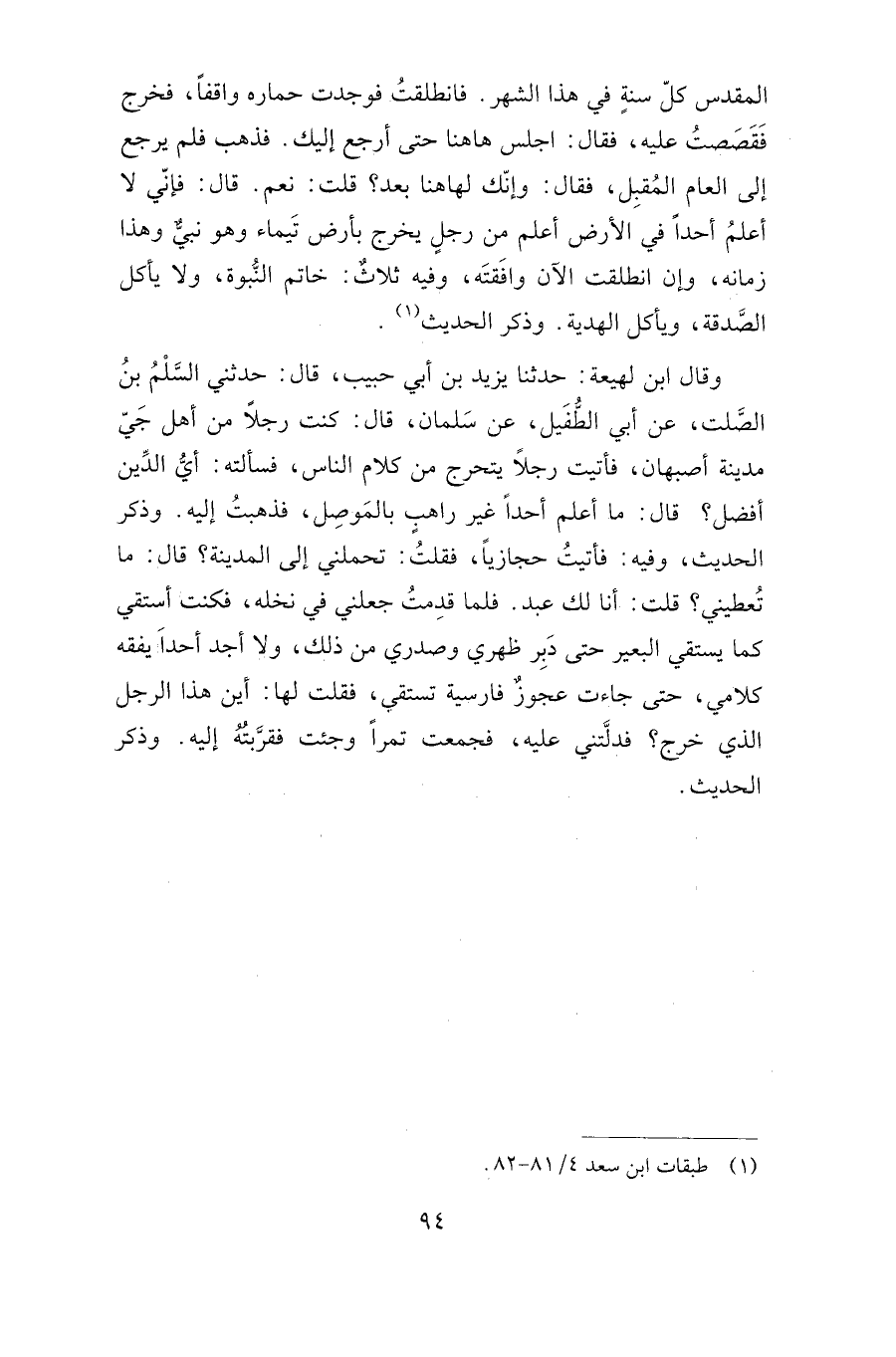 المقدس كل سنة في هذا الشهر. فانطلقت فوجدت حماره واقفا، فخرج فقصصت عليه، فقال: اجلس ههنا حتى أرجع إليك. فذهب فلم يرجع إلى العام المقبل، فقال: وإنك لههنا بعد؟ قلت: نعم. قال: فإني لا أعلم أحدا في الأرض أعلم من رجل يخرج بأرض تيماء وهو نبي وهذا زمانه، وإن انطلقت الآن وافقته، وفيه ثلاث: خاتم النبوة، ولا يأكل الصدقة، ويأكل الهدية. وذكر الحديث.