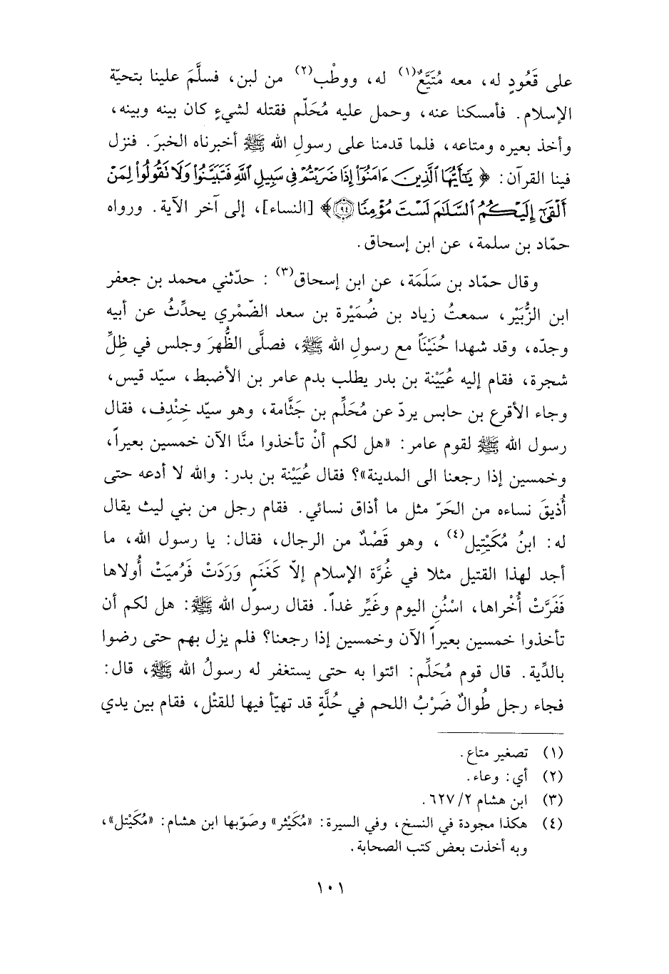 فَتَبَيَّنُوا وَلا تَقُولُوا لِمَنْ أَلْقَى إِلَيْكُمُ السَّلامَ لَسْتَ مُؤْمِنًا} [النساء: 94] ، إلى آخر الآية. ورواه حماد بن سلمة، عن ابن إسحاق.