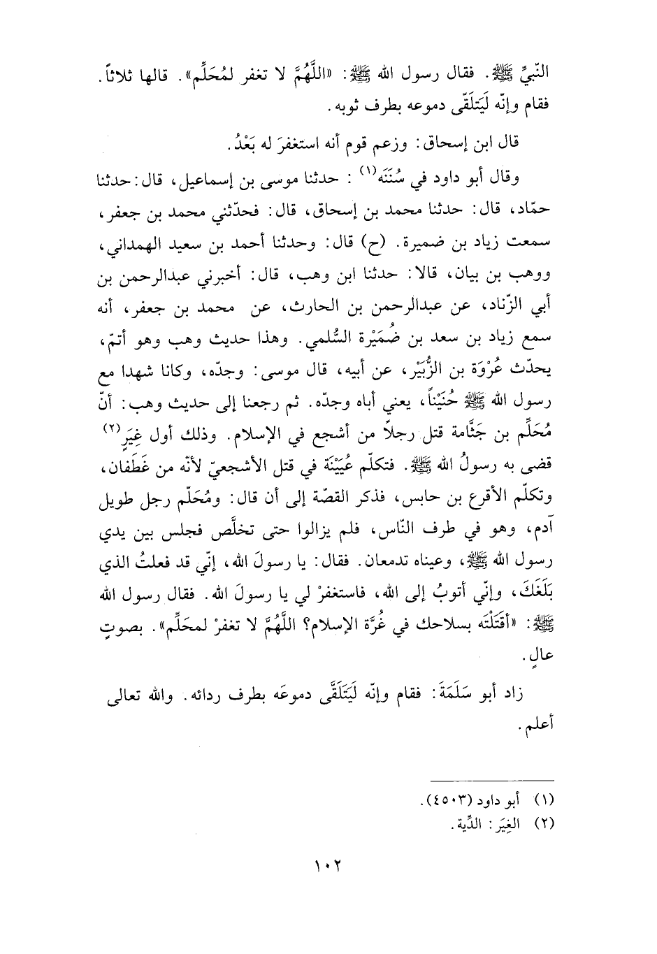وقال أبو داود في سننه: حدثنا موسى بن إسماعيل، قال: حدثنا حماد، قال: حدثنا محمد بن إسحاق، قال: فحدثني محمد بن جعفر، سمعت زياد بن ضميرة. "ح" قال: وحدثنا أحمد بن سعيد الهمداني، ووهب بن بيان، قالا: حدثنا ابن وهب، قال: أخبرني عبد الرحمن بن أبي الزناد، عن عبد الرحمن بن الحارث، عن محمد بن جعفر، أنه سمع زياد بن سعد بن ضميرة السلمي. وهذا حديث وهب وهو أتم، يحدث عروة بن الزبير، عن أبيه، قال موسى: وجده، وكانا شهدا مع رسول الله صلى الله عليه وسلم حنينا، يعني أباه وجده. ثم رجعنا إلى حديث وهب: أن محلم بن جثامة قتل رجلا من أشجع في الإسلام. وذلك أول غير قضى به رسول الله صلى الله عليه وسلم. فتكلم عيينة في قتل الأشجعي؛ لأنه من غطفان، وتكلم الأقرع بن حابس، فذكر القصة إلى أن قال: ومحلم رجل طويل آدم، وهو طرف الناس، فلم يزالوا حتى تخلص فجلس بين يدي رسول الله صلى الله عليه وسلم، وعيناه تدمعان. فقال: يا رسول الله، إني قد فعلت الذي بلغك، وإني أتوب إلى الله، فاستغفر لي يا رسول الله. فقال رسول الله صلى الله عليه وسلم: "أقتلته بسلاحك في غرة الإسلام؟ اللهم لا تغفر لمحلم". بصوت عال.