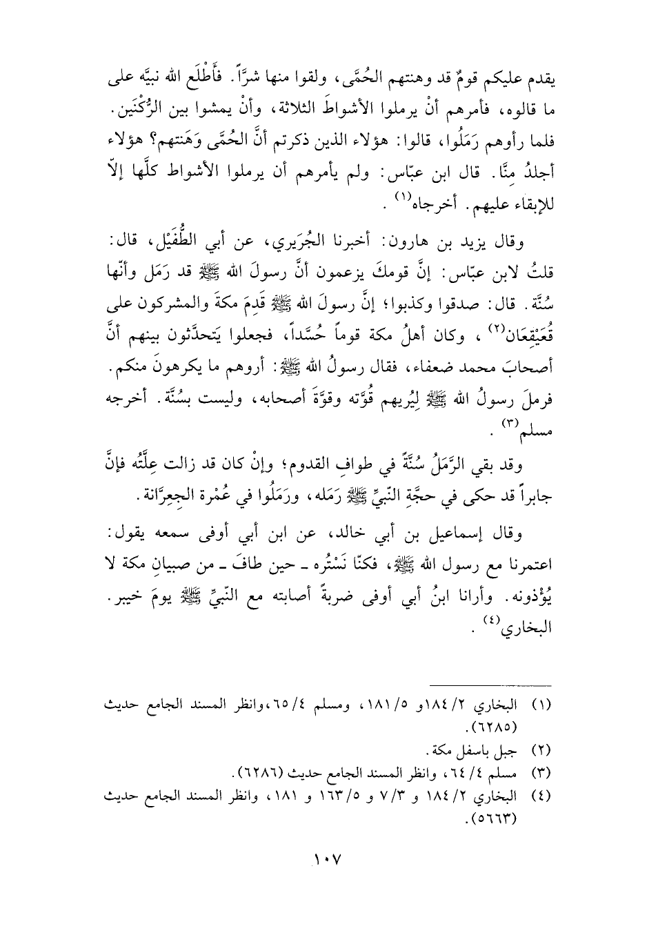 وقال يزيد بن هارون: أخبرنا الجريري، عن أبي الطفيل، قال: قلت لابن عباس: إن قومك يزعمون أن رسول الله صلى الله عليه وسلم قد رمل وأنها سنة. قال: صدقوا وكذبوا؛ إن رسول الله صلى الله عليه وسلم قدم مكة والمشركون على قعيقعان، وكان أهل مكة قوما حسدا، فجعلوا يتحدثون بينهم أن أصحاب محمد ضعفاء، فقال رسول الله صلى الله عليه وسلم: "أروهم ما يكرهون منكم". فرمل رسول الله صلى الله عليه وسلم ليريهم قوته وقوة أصحابه، وليست بسنة. أخرجه مسلم.