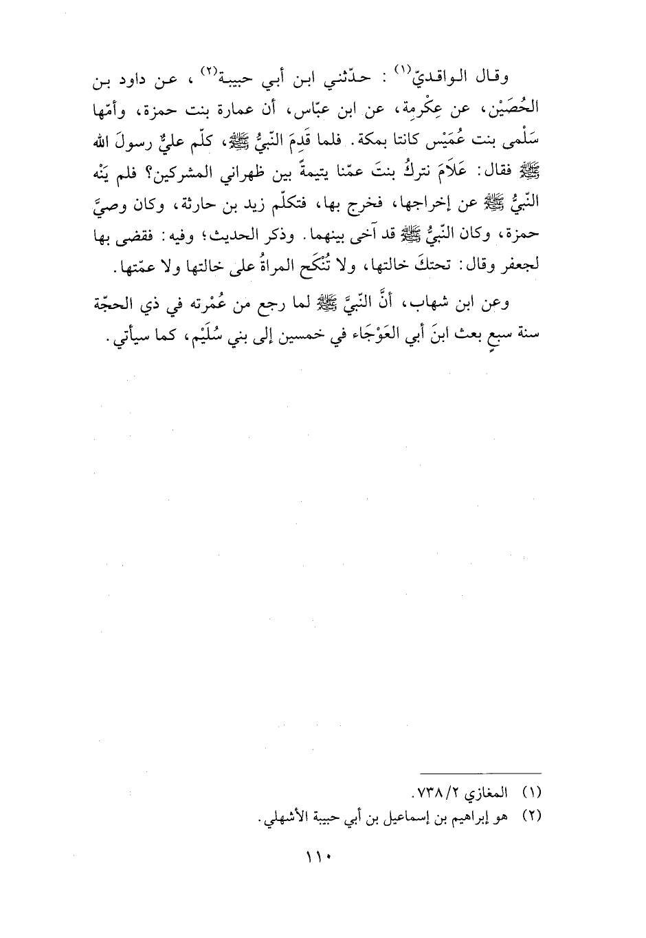وقال الواقدي: حدثني ابن أبي حبيبة، عن داود بن الحصين، عن عكرمة، عن ابن عباس، أن عمارة بنت حمزة، وأمها سلمى بنت عميس كانتا بمكة. فلما قدم النبي صلى الله عليه وسلم، كلم علي رسول الله صلى الله عليه وسلم فقال: علام نترك بنت عمنا يتيمة بين ظهراني المشركين؟ فلم ينه النبي صلى الله عليه وسلم عن إخراجها، فخرج بها، فتكلم زيد بن حارثة، وكان وصي حمزة، وكان النبي صلى الله عليه وسلم قد آخى بينهما. وذكر الحديث؛ وفيه: فقضى بها لجعفر وقال: "تحتك خالتها، ولا تنكح المرأة على خالتها ولا عمتها".