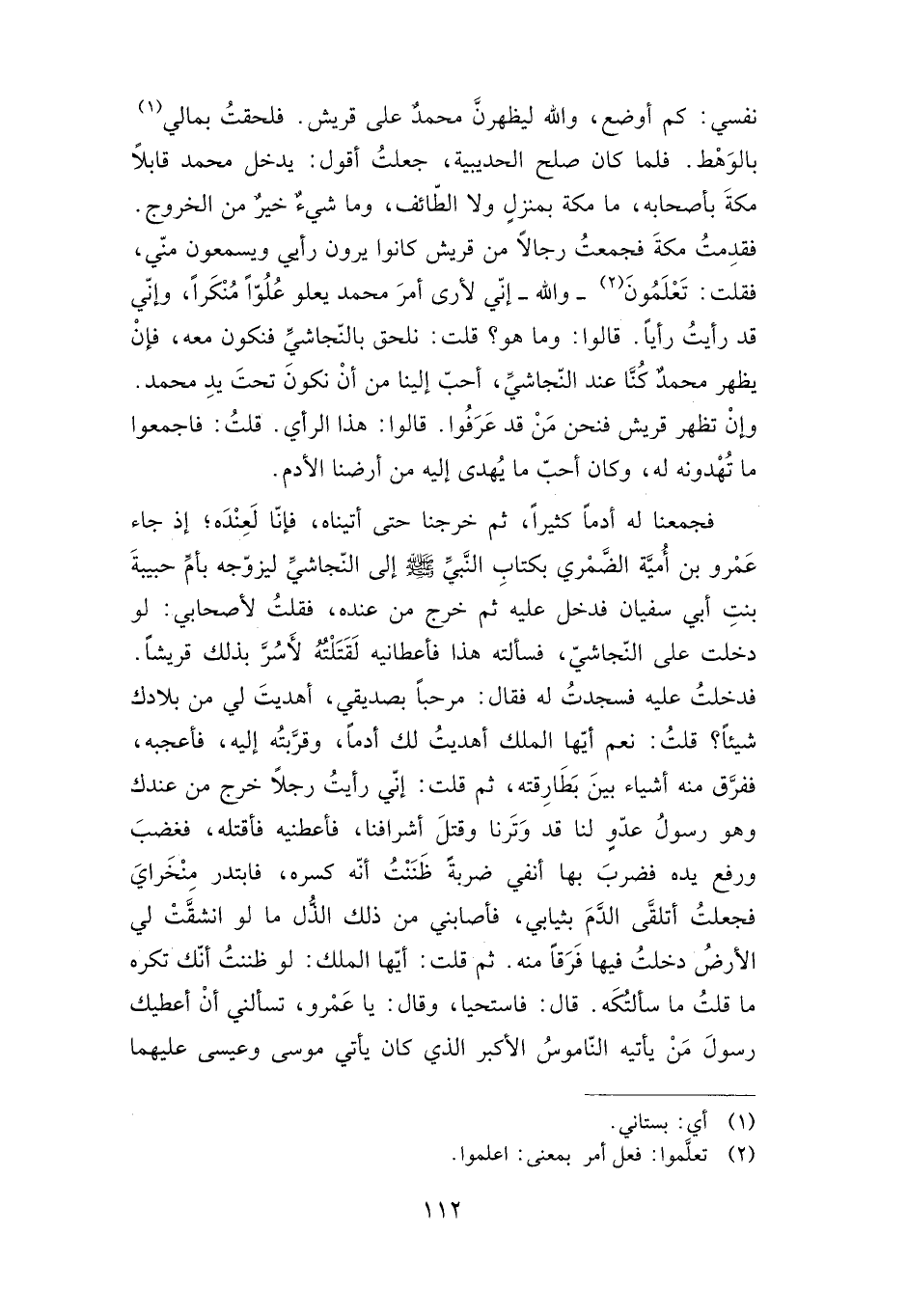 فجمعنا له أدما كثيرا، ثم خرجنا حتى أتيناه، فإنا لعنده؛ إذ جاء عمرو بن أمية الضمري بكتاب النبي صلى الله عليه وسلم إلى النجاشي ليزوجه بأم حبيبة بنت أبي سفيان فدخل عليه ثم خرج من عنده، فقلت لأصحابي: لو دخلت على النجاشي، فسألته هذا فأعطانيه لقتلته لأسر بذلك قريشا. فدخلت عليه فسجدت له فقال: مرحبا بصديقي، أهديت لي من بلادك شيئا؟ قلت: