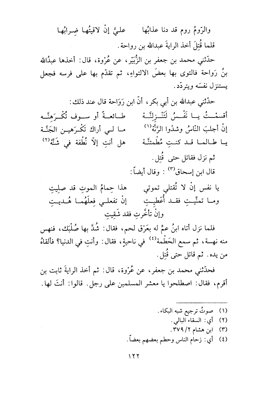 حدثني محمد بن جعفر بن الزبير، عن عروة، قال: أخذها عبد الله بن رواحة فالتوى بها بعض الالتواء، ثم تقدم بها على فرسه فجعل يستنزل نفسه ويتردد.