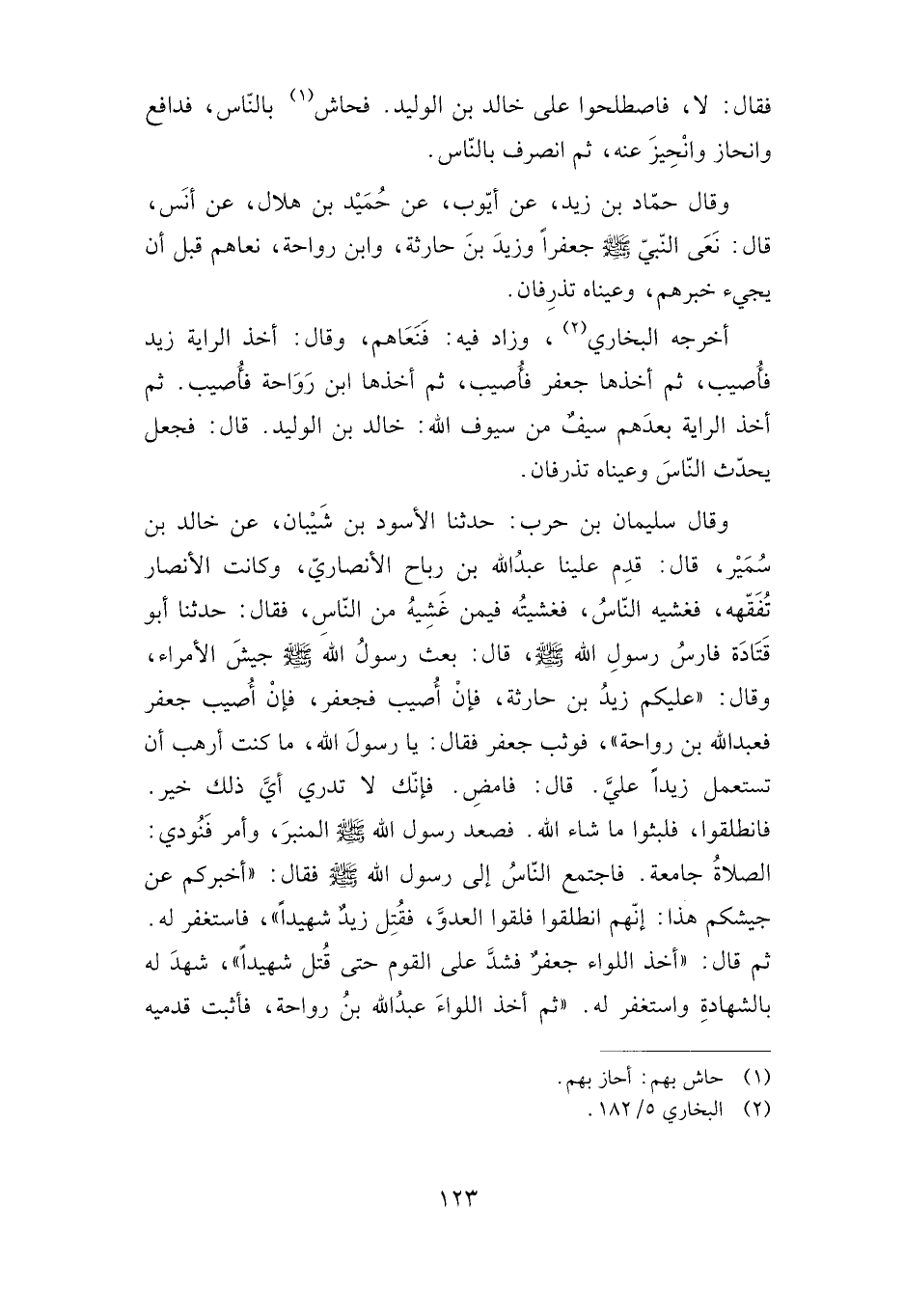 وقال حماد بن زيد، عن أيوب، عن حميد بن هلال، عن أنس، قال: نعى النبي صلى الله عليه وسلم جعفرا وزيد بن حارثة، وابن رواحة، نعاهم قبل أن يجيء خبرهم، وعيناه تذرفان.