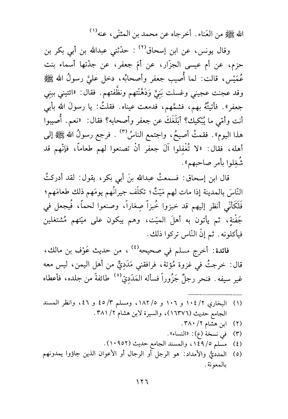 وقال يونس، عن ابن إسحاق: حدثني عبد الله بن أبي بكر بن حزم، عن أم عيسى الجزار، عن أم جعفر، عن جدتها أسماء بنت عميس، قالت: لما أصيب جعفر وأصحابه، دخل علي رسول الله صلى الله عليه وسلم وقد عجنت وغسلت بني ودهنتهم ونظفتهم. فقال: "ائتيني ببني جعفر". فأتيته بهم، فشمهم، فدمعت عيناه. فقلت: يا رسول الله بأبي أنت وأمي ما يبكيك؟ أبلغك عن جعفر وأصحابه؟ فقال: "نعم. أصيبوا هذا اليوم". فقمت أصيح، واجتمع الناس. فرجع رسول الله صلى الله عليه وسلم إلى أهله، فقال: "لا تغفلوا آل جعفر أن تصنعوا لهم طعاما، فإنهم قد شغلوا بأمر صاحبهم".