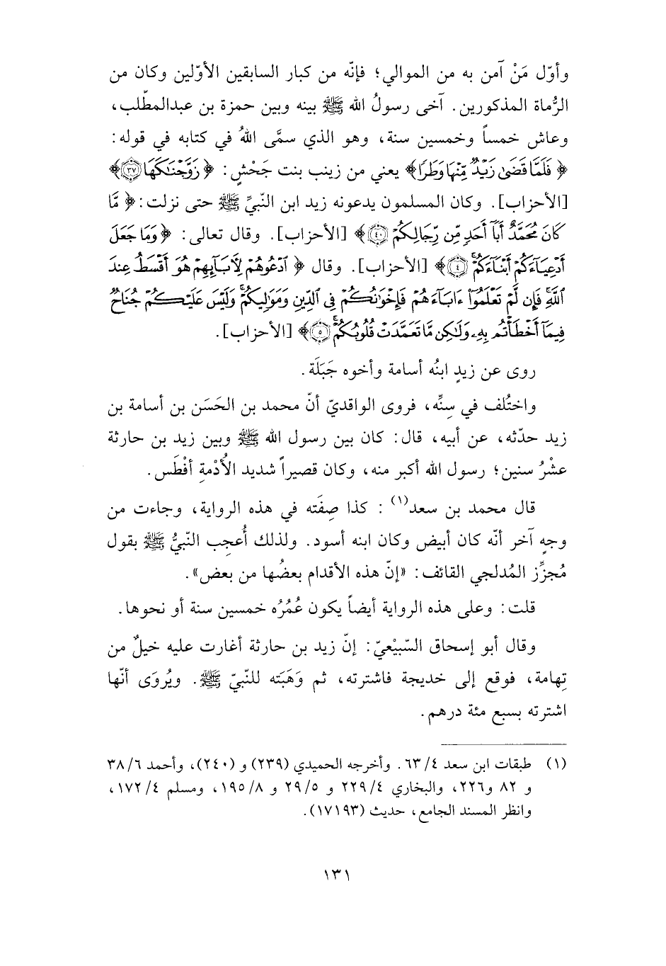 وأول من آمن به من الموالي؛ فإنه من كبار السابقين الأولين وكان من الرماة المذكورين. آخى رسول الله صلى الله عليه وسلم بينه وبين حمزة بن عبد المطلب، وعاش خمسا وخمسين سنة، وهو الذي سمى الله في كتابه في قوله: {تَخْشَاهُ فَلَمَّا قَضَى زَيْدٌ مِنْهَا وَطَرًا} يعني من زينب بنت جحش: {زَوَّجْنَاكَهَا} [الأحزاب: 37] ، وكان المسلمون يدعونه زيد ابن النبي صلى الله عليه وسلم حتى نزلت: {مَا كَانَ مُحَمَّدٌ أَبَا أَحَدٍ مِنْ رِجَالِكُمْ} [الأحزاب: 40] ، وقال -تعالى: {وَمَا جَعَلَ أَدْعِيَاءَكُمْ أَبْنَاءَكُمْ} [الأحزاب: 4] ، وقال: {ادْعُوهُمْ لِآبَائِهِمْ هُوَ أَقْسَطُ عِنْدَ اللَّهِ فَإِنْ لَمْ تَعْلَمُوا آبَاءَهُمْ فَإِخْوَانُكُمْ فِي الدِّينِ وَمَوَالِيكُمْ وَلَيْسَ عَلَيْكُمْ جُنَاحٌ فِيمَا أَخْطَأْتُمْ بِهِ وَلَكِنْ مَا تَعَمَّدَتْ قُلُوبُكُمْ} [الأحزاب: 5] .