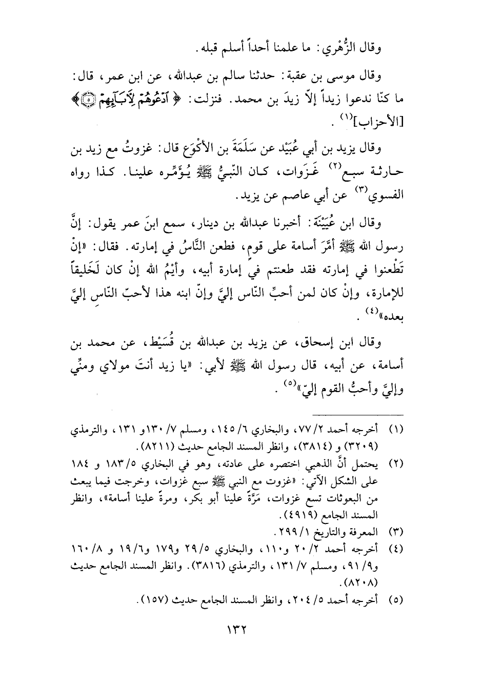 وقال موسى بن عقبة: حدثنا سالم بن عبد الله، عن ابن عمر، قال: ما كنا ندعوا زيدا إلا زيد بن محمد. فنزلت {ادْعُوهُمْ لِآبَائِهِمْ} [الأحزاب: 5] .