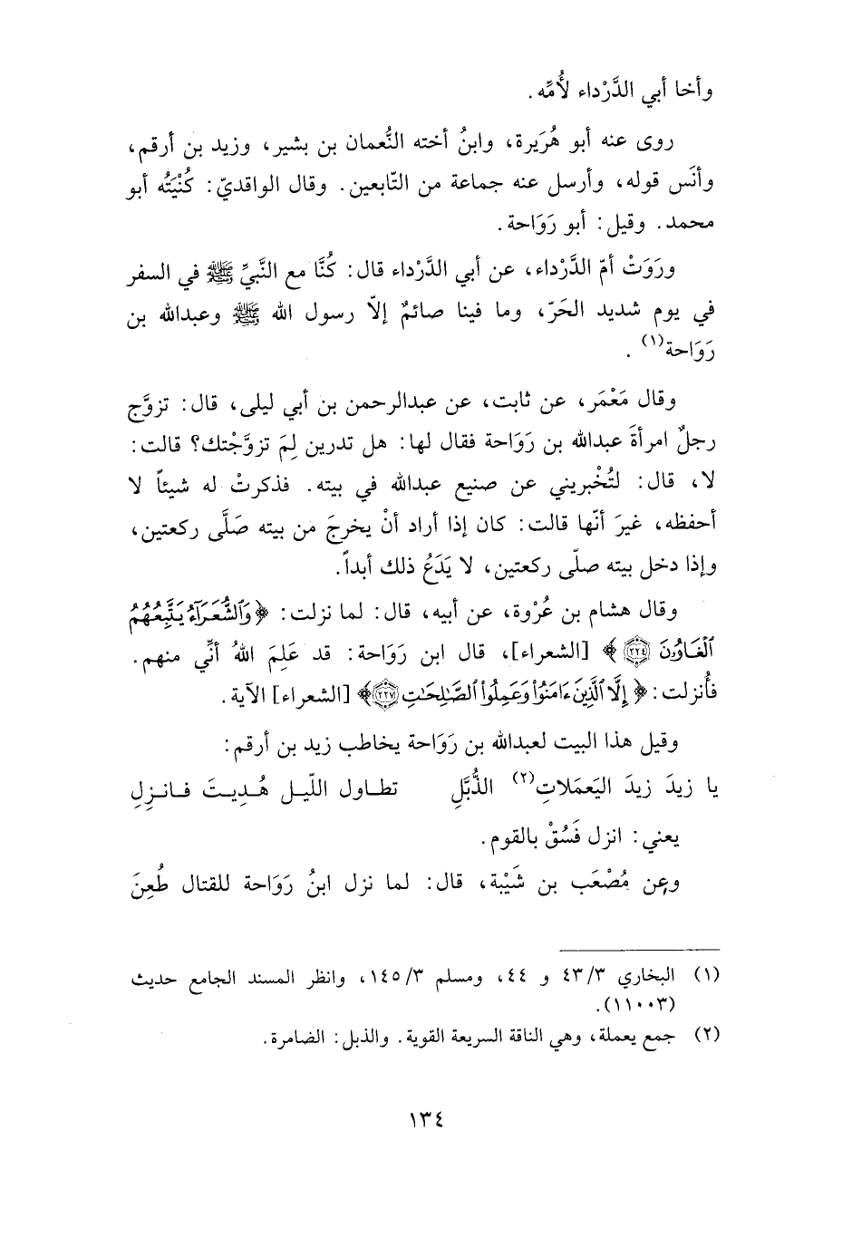 وقال هشام بن عروة، عن أبيه، قال: لما نزلت: {وَالشُّعَرَاءُ يَتَّبِعُهُمُ الْغَاوُون} [الشعراء] ، قال: ابن رواحة: قد علم الله أني منهم. فأنزلت: {إِلَّا الَّذِينَ آمَنُوا وَعَمِلُوا الصَّالِحَات} الآية [الشعراء: 227] وقيل: هذا البيت بن رواحة يخاطب زيد بن أرقم: