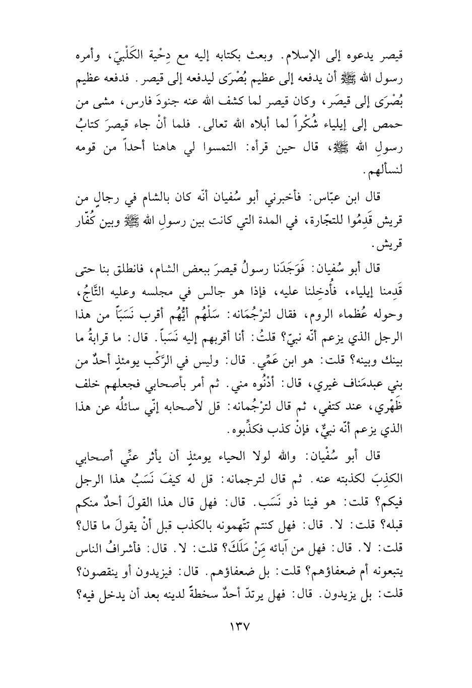 قال أبو سفيان: فوجدنا رسول قيصر ببعض الشام، فانطلق بنا حتى قدمنا إيلياء، فأدخلنا عليه، فإذا هو جالس في مجلسه وعليه التاج، وحوله عظماء الروم، فقال لترجمانه: سلهم أيهم أقرب نسبا من هذا الرجل الذي يزعم أنه نبي؟ قلت: أنا أقربهم إليه نسبا. قال: ما قرابة ما بينك وبينه؟ قلت: هو ابن عمي. قال: وليس في الركب يومئذ أحد من بني عبد مناف غيري، قال: أدنوه مني. ثم أمر بأصحابي فجعلهم خلف ظهري، عند كتفي، ثم قال لترجمانه: قل لأصحابه إني سائله عن هذا الذي يزعم أنه نبي، فإن كذب فكذبوه.