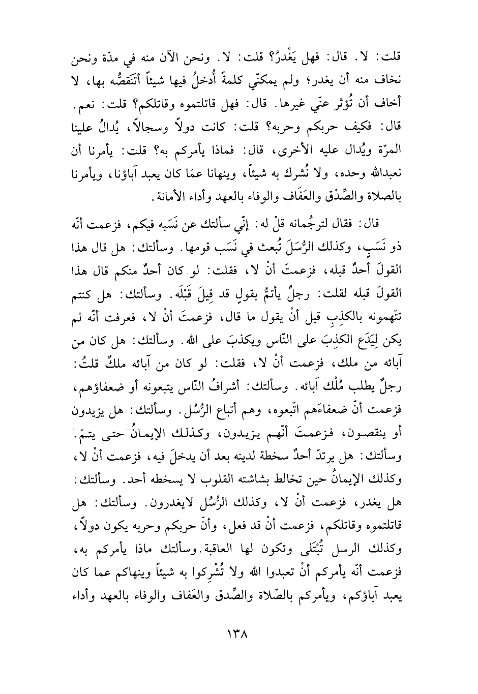 قلت: لا. قال: فهل يغدر؟ قلت: لا. ونحن الآن منه في مدة ونحن نخاف منه أن يغدر؛ ولم يمكنى كلمة أدخل فيها شيئا أنتقصه بها، لا أخاف أن تؤثر عني غيرها. قال: فهل قاتلتموه وقاتلكم؟ قلت: نعم. قال: فكيف حربكم وحربه؟ قلت: كانت دولا وسجالا، يدال عينا المرة ويدال عليه الأخرى، قال: فماذا يأمركم به؟ قلت: يأمرنا أن نعبد الله وحده، ولا نشرك به شيئا، وينهانا عما كان يعيد آباؤنا، ويأمرنا بالصلاة والصدق والعفاف والوفاء بالعهد وأداء