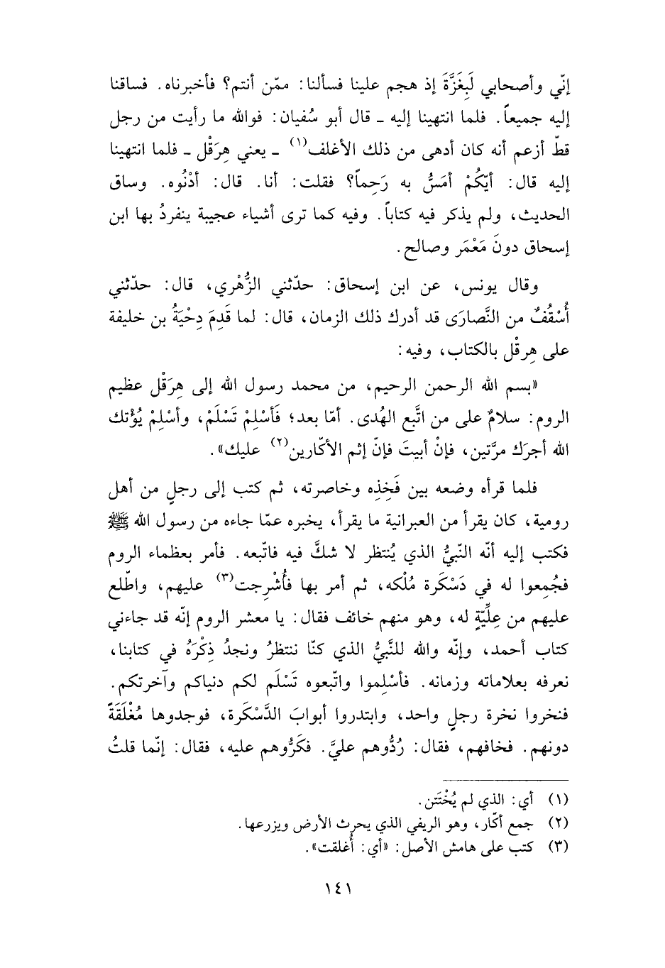 إني وأصحابي لبغزة إذ هجم علينا فسألنا: ممن أنتم؟ أخبرناه. فساقنا إليه جميعا. فلما انتهينا إليه -قال أبو سفيان: فوالله ما رأيت من رجل قط أزعم أنه كان أدهى من ذلك الأغلف -يعني هرقل- فلما انتهينا إليه قال: أيكم أمس به رحما؟ فقلت: أنا. قال: أدنوه. وساق الحديث، ولم يذكر فيه كتابًا وفيه كما ترى أشياء عجيبة ينفرد بها ابن إسحاق دون معمر وصالح.