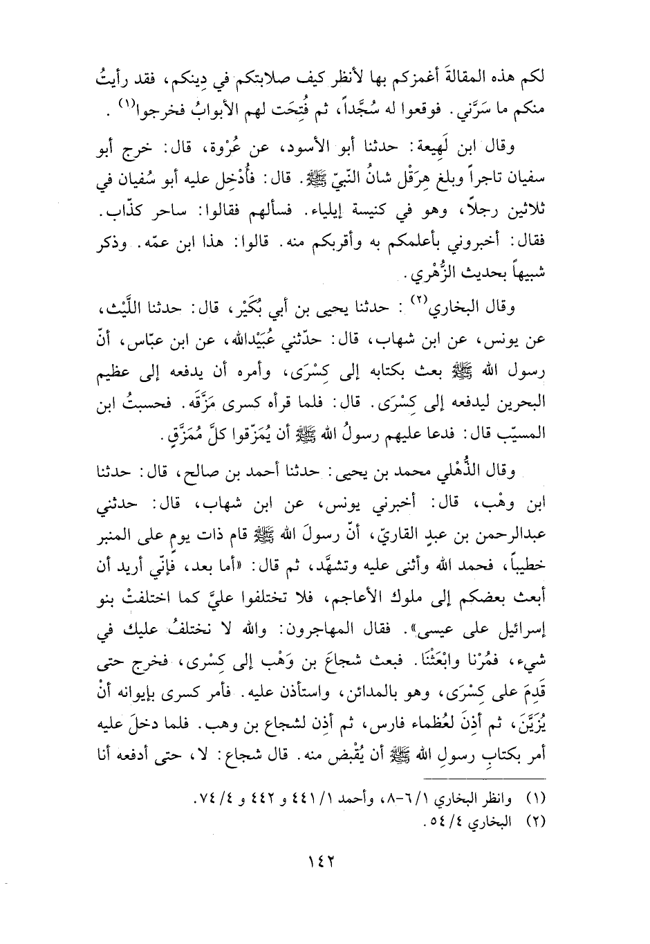 "فإني أريد أن أبعث بعضكم إلى ملوك الأعاجم، فلا تختلفوا علي كما اختلفت بنو إسرائيل على عيسى". فقال المهاجرون: والله لا نختلف عليك في شيء، فمرنا وابعثنا. فبعث شجاع بن وهب إلى كسرى، فخرج حتى قدم على كسرى، وهو بالمدائن، واستأذن عليه.