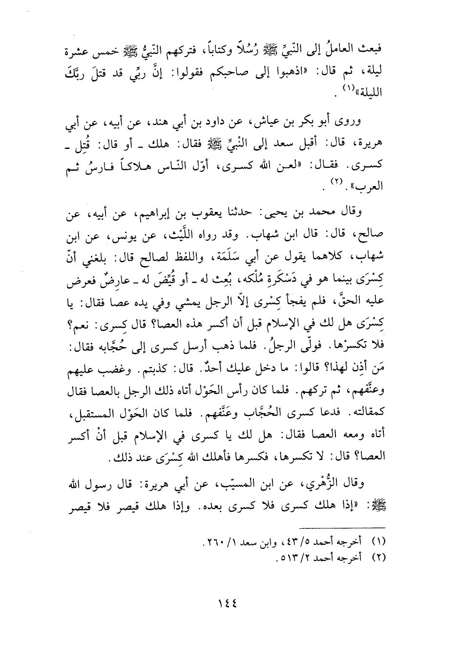وقال محمد بن يحيى: حدثنا يعقوب بن إبراهيم، عن أبيه، عن صالح، قال: قال: ابن شهاب. وقد رواه الليث، عن يونس، عن ابن شهاب، كلاهما يقول عن أبي سلمة، واللفظ لصالح قال: بلغني أن كسرى بينما هو في دسكرة ملكه، بعث له -أو قيض له- عارض فعرض عليه الحق، فلم يفجأ كسرى إلا الرجل يمشي وفي يده عصا فقال: يا كسرى هل لك في الإسلام قبل أن أكسر هذه العصا؟ قال: كسرى: نعم؟ فلا تكسرها. فولى الرجل. فلما ذهب أرسل كسرى إلى حجابه فقال: من أذن لهذا؟ قالوا: ما دخل عليك أحد. قال: كذبتم. وغضب عليهم وعنفهم، ثم تركهم. فلما كان رأس الحول أتاه ذلك الرجل بالعصا فقال كمقالته. فدعا كسرى الحجاب وعنفهم. فلما كان الحول المستقبل، أتاه ومعه العصا فقال: هل لك يا كسرى في الإسلام قبل أن أكسر العصا؟ قال: لا تكسرها، فكسرها فأهلك الله كسرى عند ذلك.