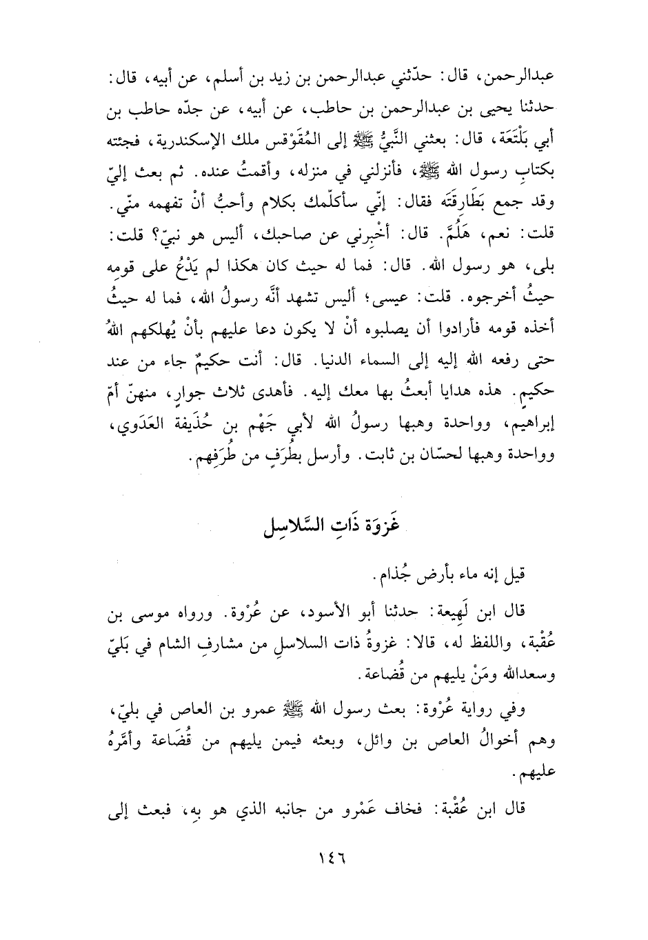 عبد الرحمن، قال: حدثني عبد الرحمن بن زيد بن أسلم، عن أبيه، قال: حدثنا يحيى بن عبد الرحمن بن حاطب، عن أبيه، عن جده حاطب بن أبي بلتعة، قال: بعثني النبي صلى الله عليه وسلم إلى المقوقس ملك الإسكندرية، فجئته بكتاب رسول الله صلى الله عليه وسلم، فأنزلني في منزله، وأقمت عنده. ثم بعث إلي وقد جمع بطارقته فقال: إني سأكلمك بكلام وأحب أن تفهمه مني. قلت: نعم، هلم. قال: أخبرني عن صاحبك، أليس هو نبي؟ قلت: بلى، هو رسول الله. قال: فما له حيث كان هكذا لم يدع على قومه حيث أخرجوه. قلت: عيسى؛ أليس تشهد أنه رسول الله، فما له حديث أخذه قومه فأرادوا أن يصلبوه أن لا يكون دعا عليهم بأن يهلكم الله حتى رفعه الله إليه إلى السماء الدنيا. قال: أنت حكيم جاء من عند حكيم. هذه هدايا أبعث بها معك إليه. فأهدى ثلاث جوار، منهن أم إبراهيم، وواحدة وهبها رسول الله لأبي جهم بن حذيفة العدوي، وواحدة وهبها لحسان بن ثابت. وأرسل بطرف من طرفهم.