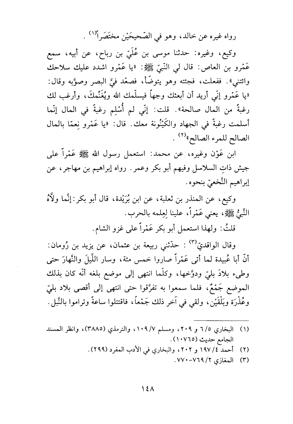 ابن عون وغيره، عن محمد، استعمل رسول الله صلى الله عليه وسلم عمرا على جيش ذات السلاسل وفيهم أبوبكر وعمر. رواه إبراهيم بن مهاجر، عن إبراهيم النخعى بنحوه.