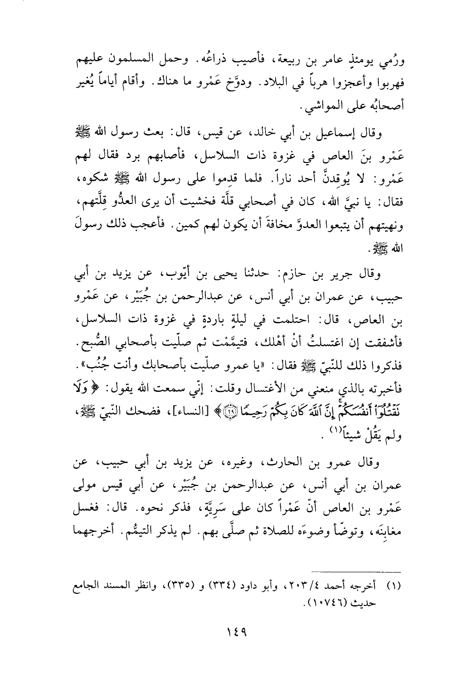 وقال جرير بن حازم: حدثنا يحيى بن أيوب، عن يزيد بن أبي حبيب، عن عمران بن أبي أنس، عن عبد الرحمن بن جبير، عن عمرو بن العاص، قال: احتلمت في ليلة باردة في غزوة ذات السلاسل، فأشفقت إن اغتسلت أن أهلك، فتيممت ثم صليت بأصحابي الصبح، فذكروا ذلك للنبي صلى الله عليه وسلم فقال: "يا عمرو صليت بأصحابك وأنت جنب". فأخبرته بالذي منعني من الاغتسال وقلت: إني سمعت الله يقول: {وَلا تَقْتُلُوا أَنْفُسَكُمْ إِنَّ اللَّهَ كَانَ بِكُمْ رَحِيمًا} [النساء: 29] ، فضحك النبي صلى الله عليه وسلم، ولم يقل شيئا.