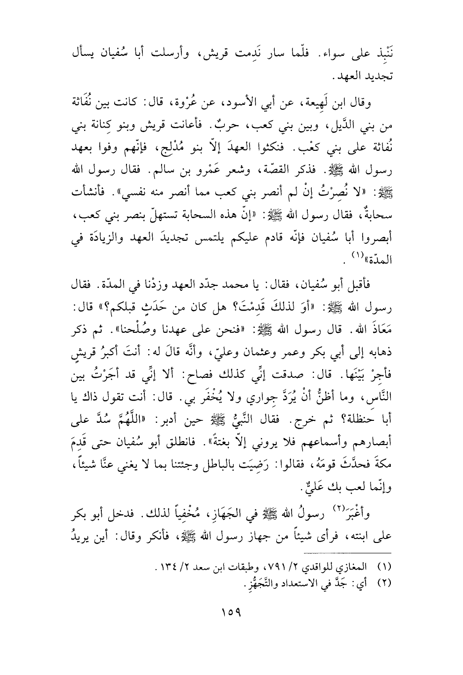 فأقبل أبو سفيان، فقال: يا محمد جدد العهد وزدنا في المدة. فقال: رسول الله صلى الله عليه وسلم: "أو لذلك قدمت؟ هل كان من حدث قبلكم"؟ قال: معاذ الله. قال رسول الله صلى الله عليه وسلم: "فنحن على عهدنا وصلحنا". ثم ذكر ذهابه إلى أبي بكر وعمر وعثمان وعلي، وأنه قال له: أنت أكبر قريش فأجر بينها. قال: صدفت إني كذلك فصاح: ألا إني قد أجرت بين الناس، وما أظن أن يرد جواري ولا يخفر بي، قال: أنت تقول ذلك يا أبا حنظلة؟ ثم خرج، فقال النبي صلى الله عليه وسلم حين أدبر: "اللهم سد على أبصارهم وأسماعهم فلا يروني إلا بغتة". فانطلق أبو سفيان حتى قدم مكة فحدث قومه، فقالوا: رضيت بالباطل وجئتنا بما لا يغني عنا شيئا، وإنما لعب بك علي.