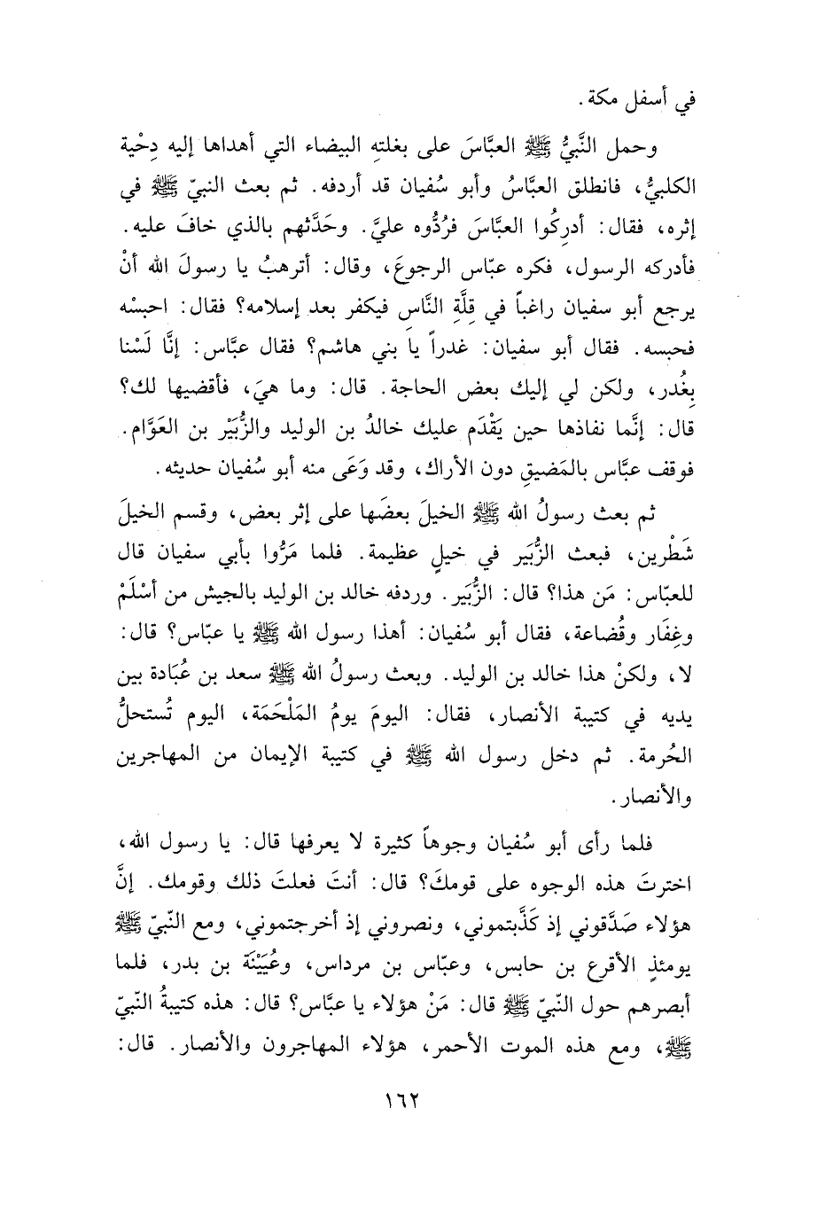 قال: وما هي، فأقضيها لك؟ قال: إنما نفاذها حين تقدم عليك خالد بن الوليد والزبير بن العوام. فوقف عباس بالمضيق دون الأراك، وقد وعى منه أبو سفيان حديثه.