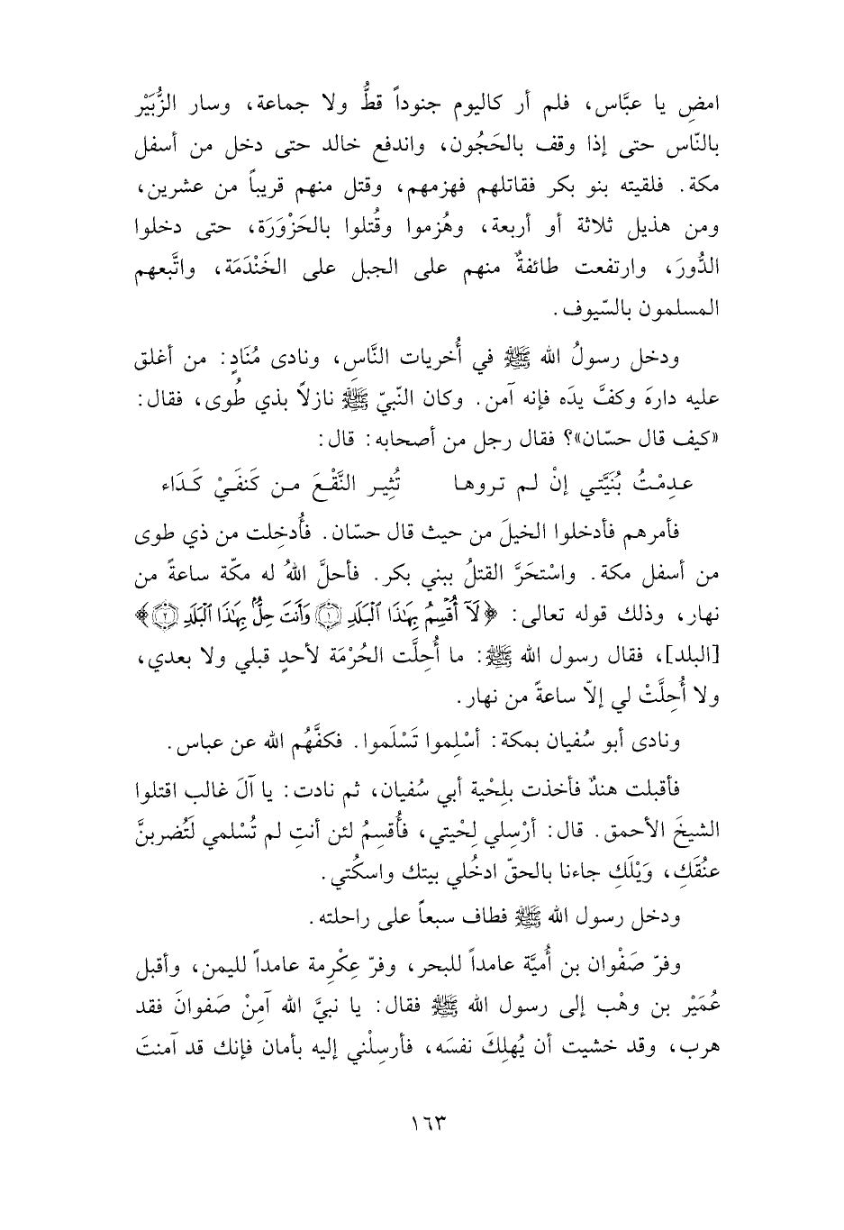 ودخل رسول الله صلى الله عليه وسلم في أخريات الناس، ونادى مناد: من أغلق عليه داره وكف يده فإنه آمن. وكان النبي صلى الله عليه وسلم نازلًا بذي طوى، فقال: "كيف قال حسان"؟ فقال رجل من أصحابه: قال: