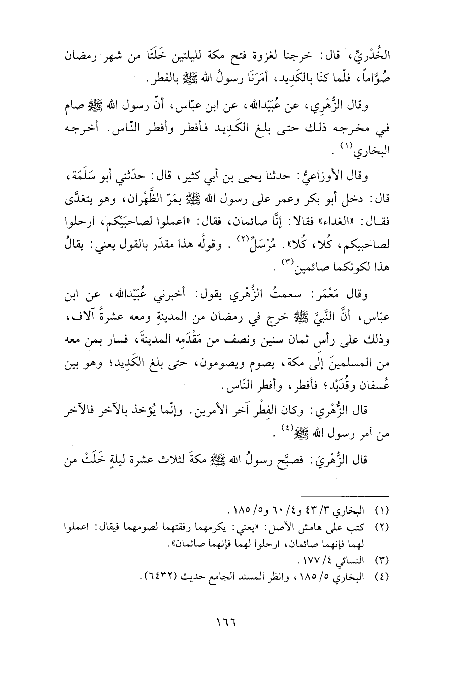 قال الزهري: وكان الفطر آخر الأمرين. وإنما يؤخذ بالآخر فالآخر من أمر رسول الله صلى الله عليه وسلم.