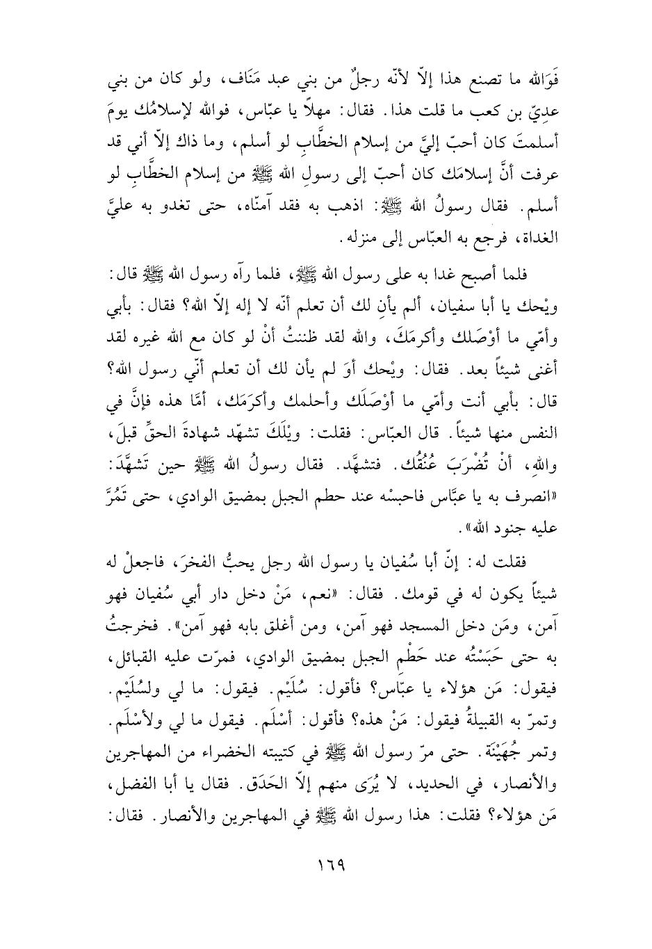 فوالله ما تصنع هذا إلا؛ لأنه رجل من بني عبد مناف، ولو كان من بني عدي بن كعب ما قلت هذا. مهلا يا عباس، فوالله لإسلامك يوم أسلمت كان أحب إلي من إسلام الخطاب لو أسلم، وما ذاك إلا أني قد عرفت أن إسلامك كان أحب إلى رسول الله صلى الله عليه وسلم من إسلام الخطاب لو أسلم. فقال: رسول الله صلى الله عليه وسلم: "اذهب به فقد آمناه، حتى تغدو به علي الغداة"، فرجع به العباس إلى منزله.