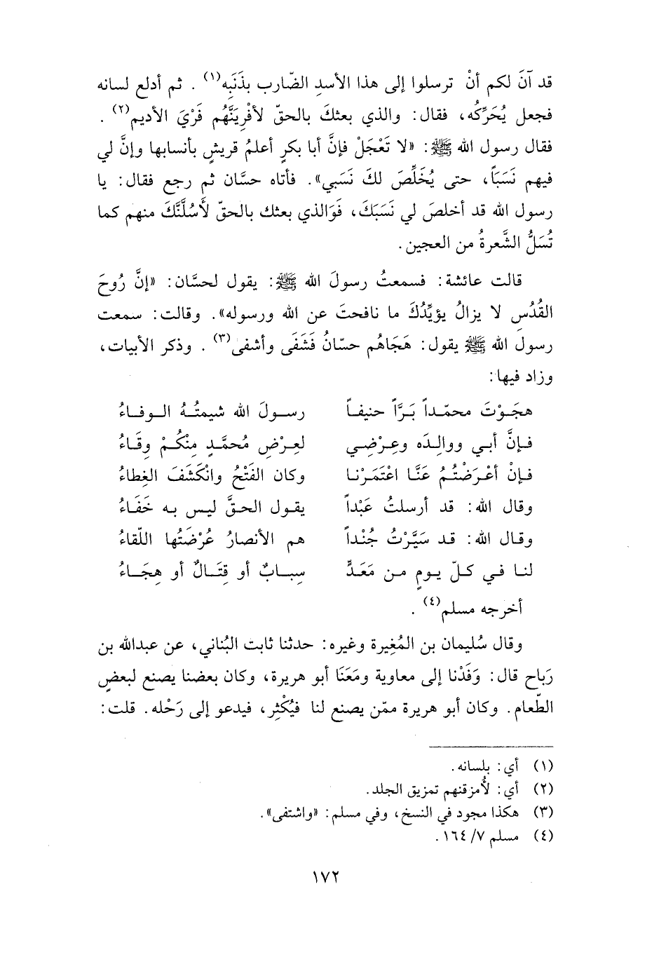 قالت عائشة: فسمعت رسول الله صلى الله عليه وسلم: يقول لحسان: "إن روح القدس لا يزال يؤيدك ما نافحت عن الله ورسوله". وقالت: سمعت رسول الله صلى الله عليه وسلم يقول: "هجاهم حسان فشفى وأشفى". وذكر الأبيات، وزاد فيها: