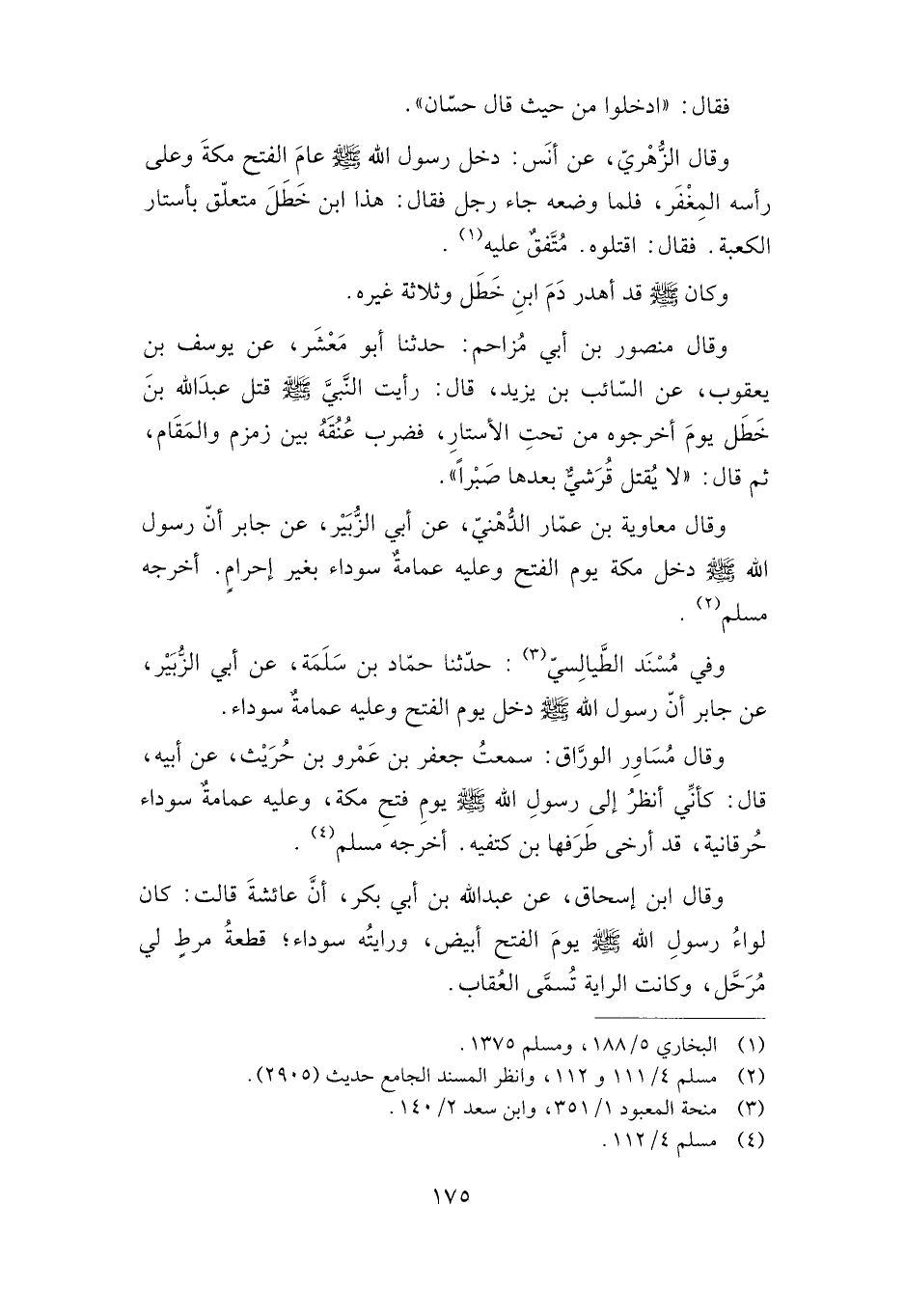 وفي مسند الطيالسي: حدثنا حماد بن سلمة، عن أبي الزبير، عن جابر أن رسول الله صلى الله عليه وسلم دخل يوم الفتح وعليه عمامة سوداء.