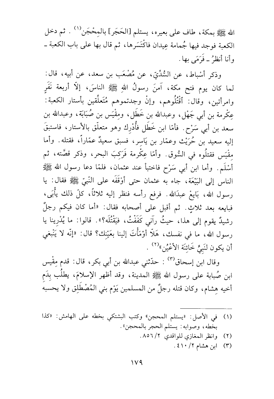 وذكر أسباط، عن السدي، عن مصعب بن سعد، عن أبيه، قال: لما كان يوم فتح مكة، آمن رسول الله صلى الله عليه وسلم الناس، إلا أربعة نفر وامرأتين، وقال: "اقتلوهم، وإن وجدتموهم متعلقين بأستار الكعبة: عكرمة بن أبي جهل، وعبد الله بن خطل، ومقيس بن صبابة، وعبد الله بن سعد بن أبي سرح". فأما ابن خطل فأدرك وهو متعلق بالأستار، فاستبق إليه سعيد بن