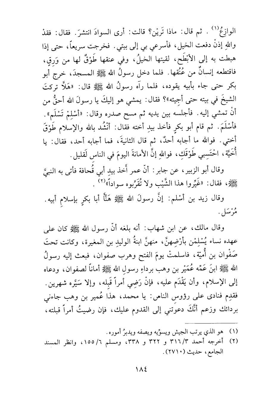 الوازع. ثم قال: ماذا ترين؟ قالت: أرى السواد انتشر. فقال: فقد والله إذن دفعت الخيل، فأسرعي بي إلى بيتي. فخرجت سريعا، حتى إذا هبطت به إلى الأبطح، لقيتها الخيل، وفي عنقها طول لها من روق، فاقتطعه إنسان من عنقها. فلما دخل رسول الله صلى الله عليه وسلم المسجد، خرج أبو بكر حتى جاء بأبيه يقوده، فلما رآه رسول الله صلى الله عليه وسلم قال: "هلا تركت الشيخ في بيته حتى أجيئه"؟ فقال: يمشي هو إليك يا رسول الله أحق من أن تمشي إليه. فأجلسه بين يديه ثم مسح صدره وقال: "أسلم تسلم".