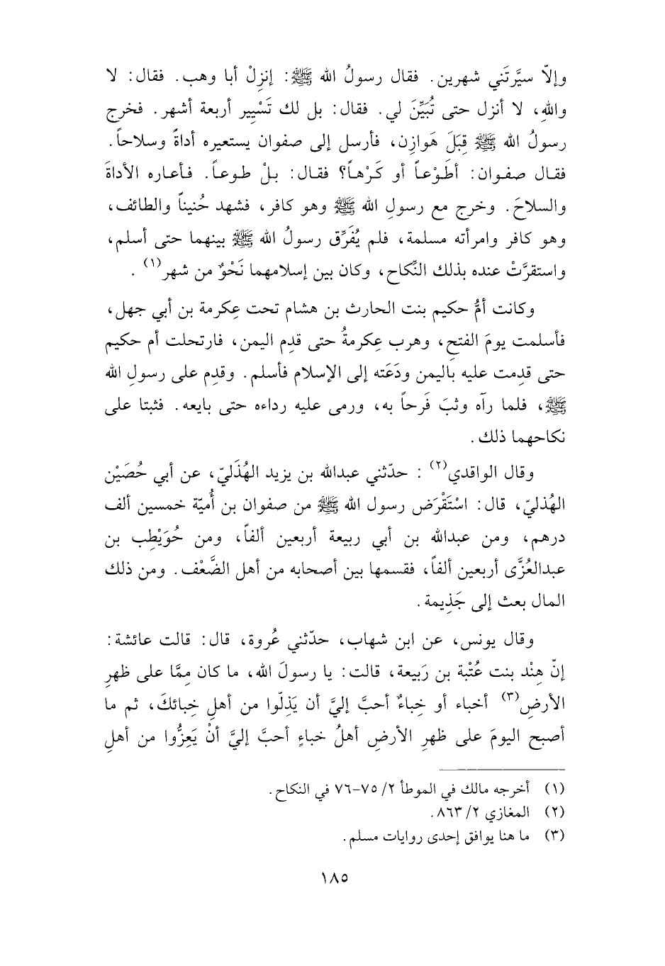 وإلا سيرتني شهرين. فقال رسول الله صلى الله عليه وسلم: "انزل أبا وهب". فقال: لا والله، لا أنزل حتى تبين لي. فقال: لك تسيير أربعة أشهر. فخرج رسول الله صلى الله عليه وسلم قبل هوازن، فأرسل إلى صفوان يستعيره أداة وسلاحا. فقال صفوان: أطوعا أو كرها؟ فقال: بل طوعا. فأعاره الأداة والسلاح. وخرج مع رسول الله صلى الله عليه وسلم وهو كافر، فشهد حنينا والطائف، وهو كافر وامرأته مسلمة، فلم يفرق رسول الله صلى الله عليه وسلم بينهما حتى أسلم، واستقرت عنده بذلك النكاح، وكان بين إسلامهما نحو من شهر.