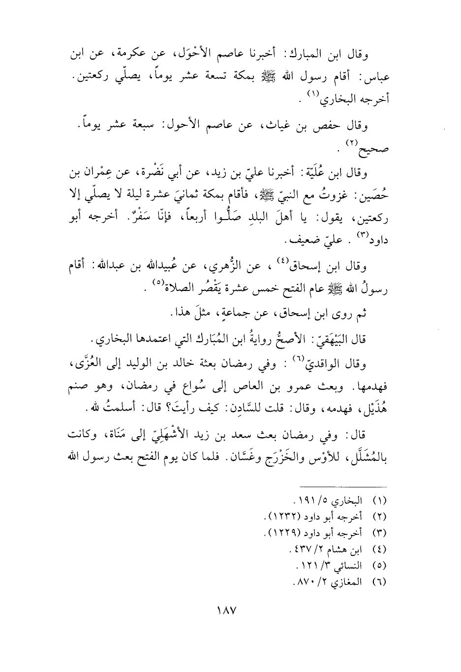 وقال ابن المبارك: أخبرنا عاصم الأحول، عن عكرمة، عن ابن عباس: أقام رسول الله صلى الله عليه وسلم بمكة تسعة عشر يوما، يصلي ركعتين. أخرجه البخاري.